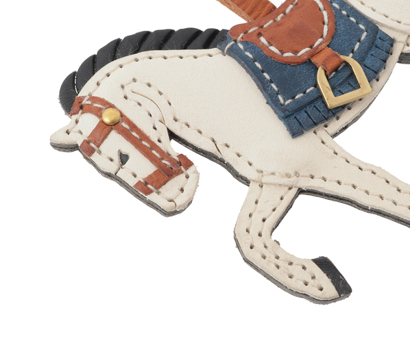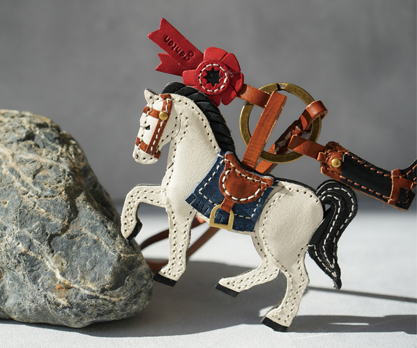 gentenの馬チャームは、この左馬をモチーフにし、丁寧なレザーワークで仕上げました。白い馬体に添えられたブーツと勲章のモチーフは、新しい年を颯爽と駆け抜けるような希望を感じさせます。
