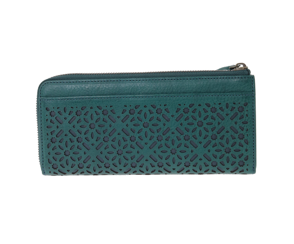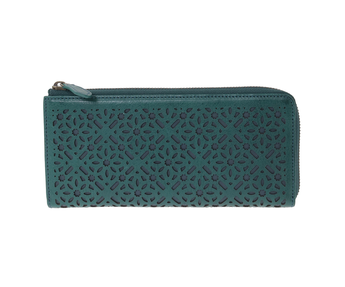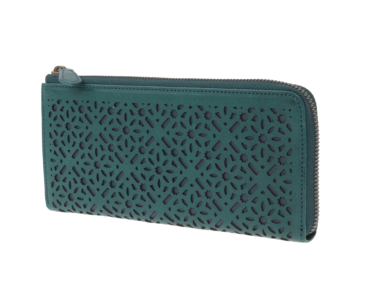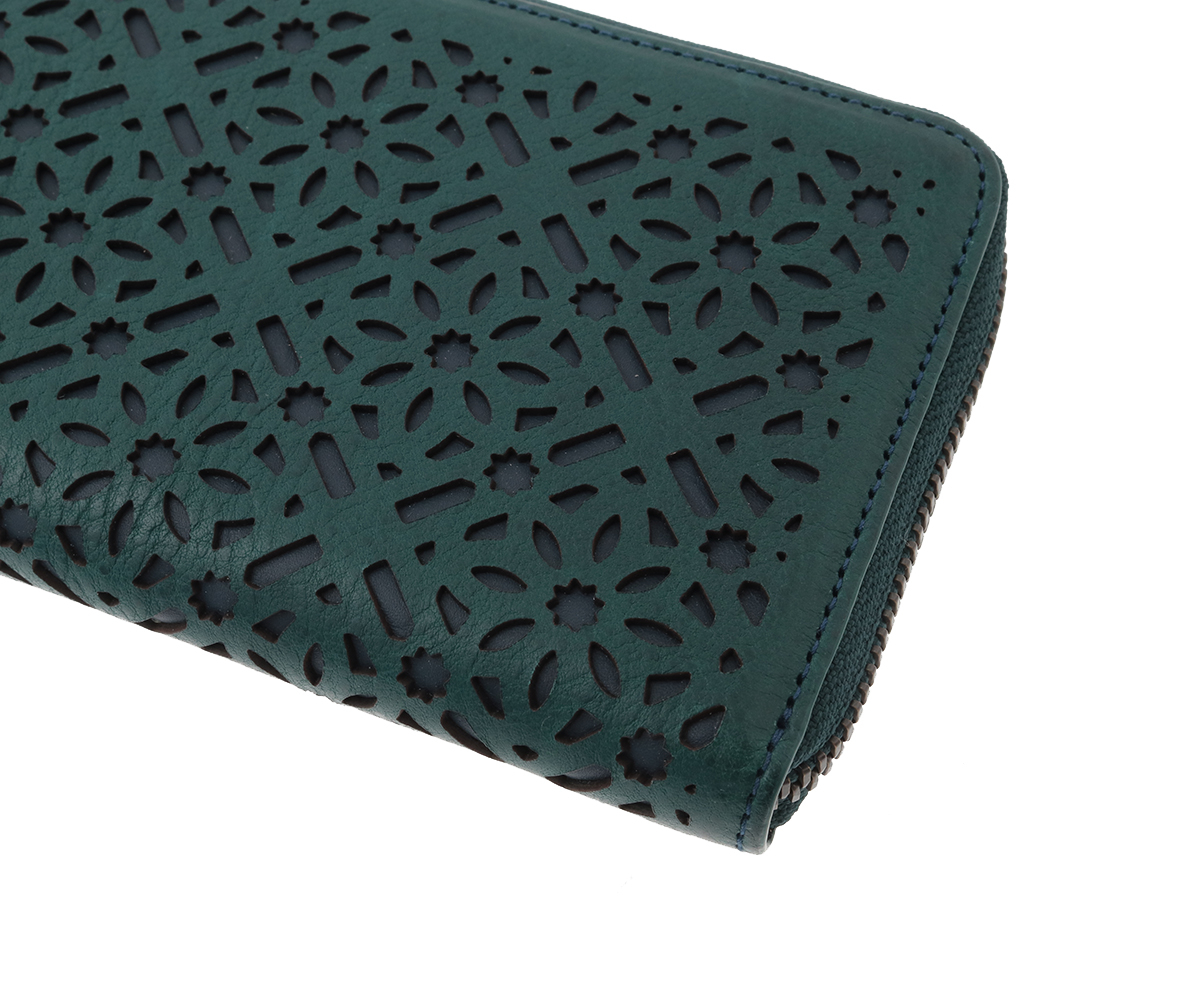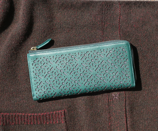 お財布の上に広がる花模様。その連続模様は、その整然とした美しさが魅力のシリーズ。