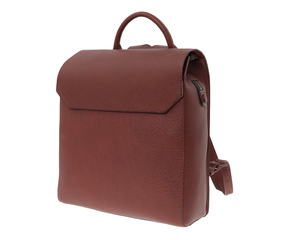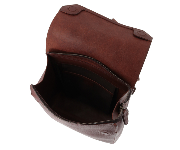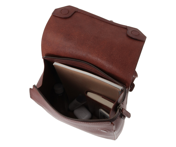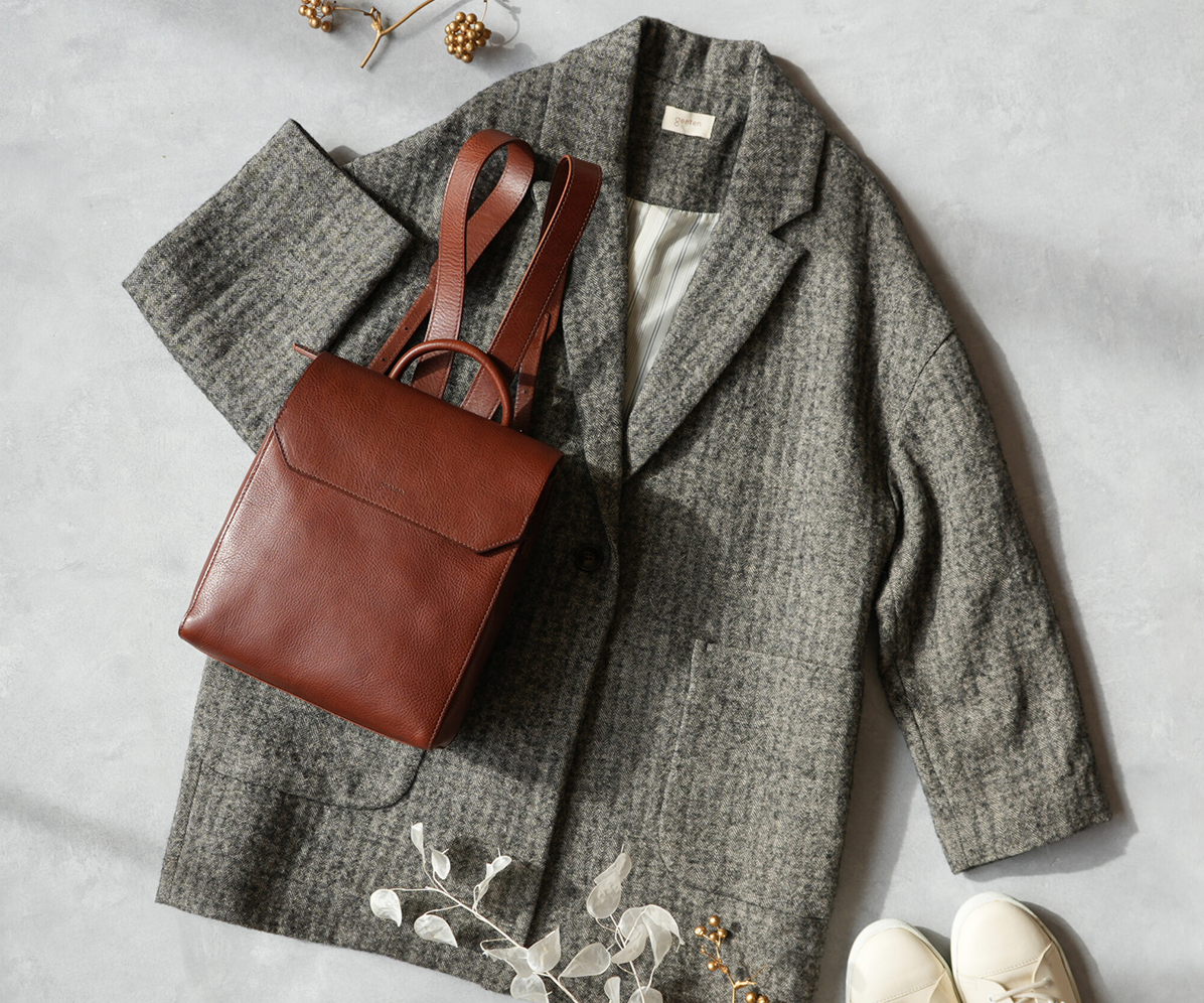 好評をいただいているリュックに、新たにひと回り小さい形をご用意しました。新型はバランスを変えて、少しスクエアにしています。長札がちょうど横に入るくらいのサイズ感です。フラップの内側部分にもファスナーがついていますが、マグネットが内蔵されているので、ファスナーを閉めなくても安定してお使いいただけます。