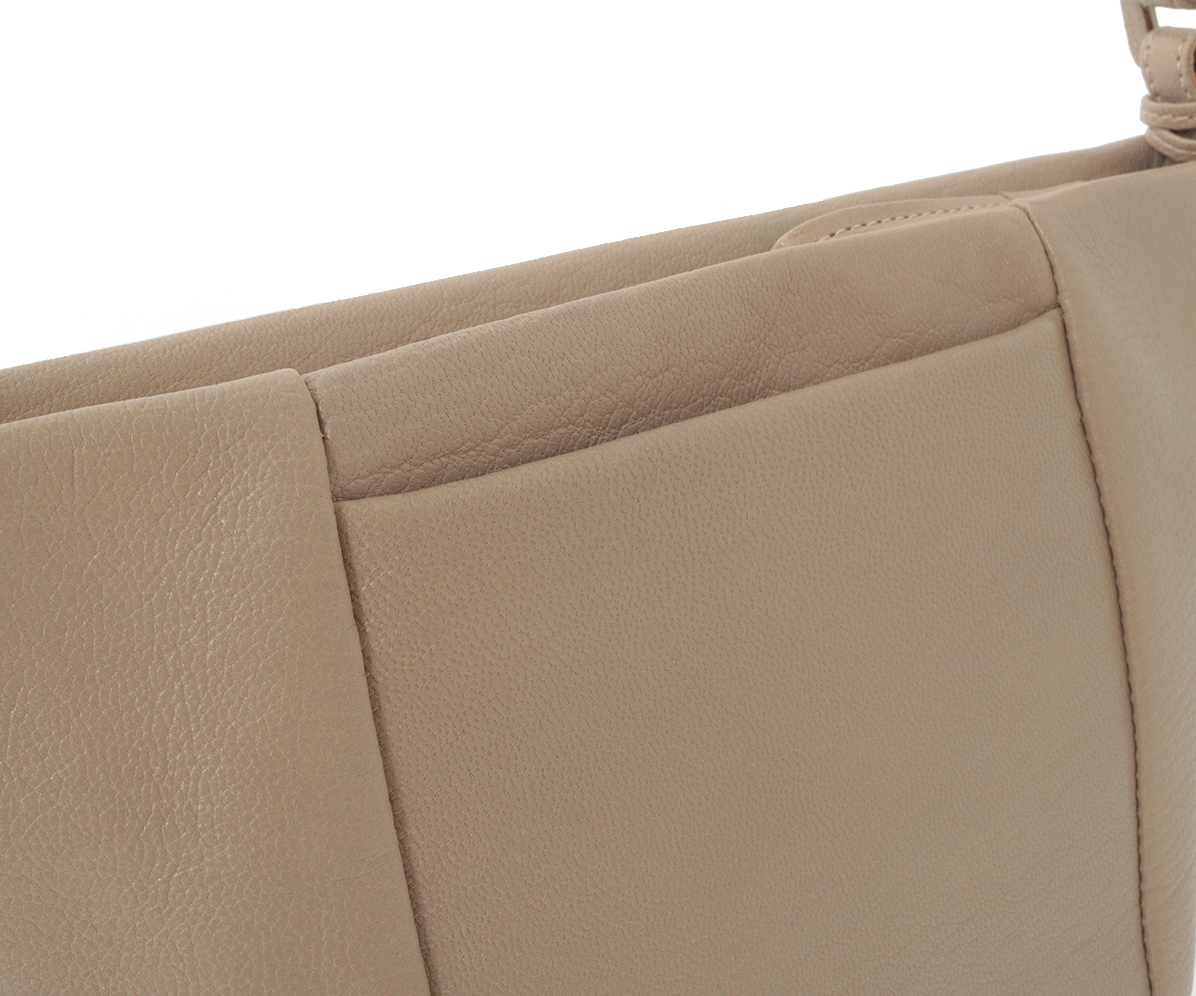 ゴートの魅力はなんといってもその軽さです。革が薄い。薄いのですが、繊維質が緻密で詰まっているので弾力性があり、しなやかでやわらか。革が自然に体のラインに添ってくれて、背中や腰骨に不自然に当たる違和感がなく、まさに「体になじむ」という言葉がぴったりきます。 また、山羊革は摩擦に比較的強い特性があるので、例えば満員電車で擦れあったり、多少の汚れをタオルなどでババッと拭いても傷になりにくいという扱いやすさがあります。