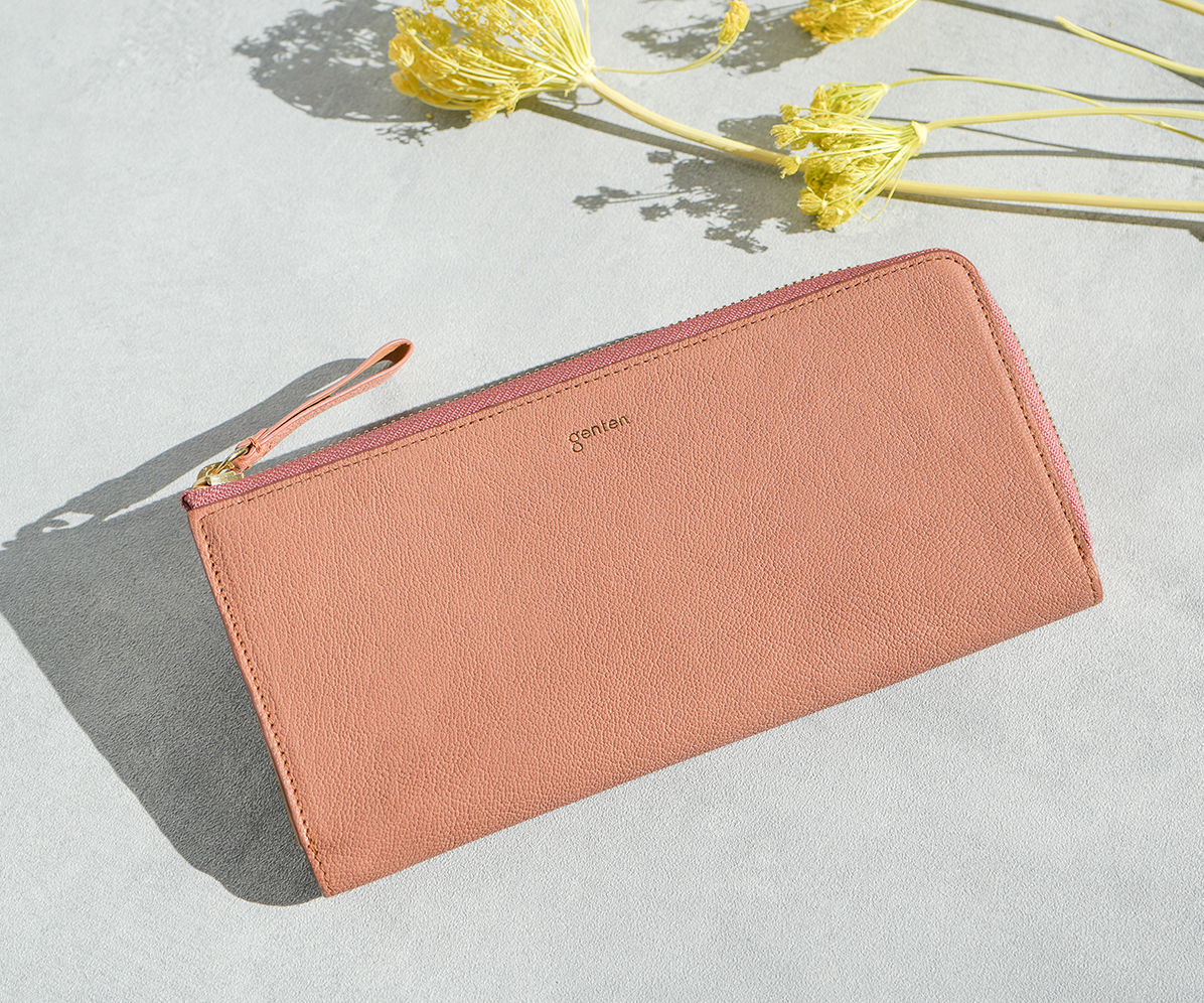フレスコではその中でも小判のゴートを使用し、きめ細やかな肌目でカジュアルになりすぎず、革の地艶の輝きを出したことで、瑞々しく上品な印象になるよう仕上げています。キャッシュレス時代を意識して、薄さを意識した型構成になっています。