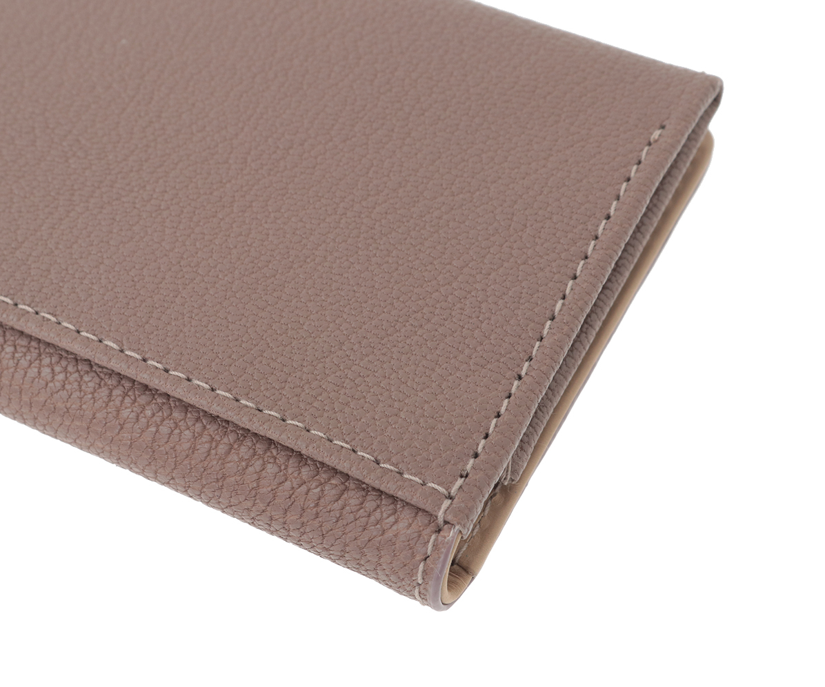 インド原皮の小判のゴートをLWGゴールドレートを獲得したインドのタンナーで鞣しています。キットまではいきませんが、小物だからこそ版が取れる小判のゴートを使用しています。シボが四角くきめ細やかで、銀面が強いのも特徴です。内装にはインドでピット鞣しをしたカーフを使用。