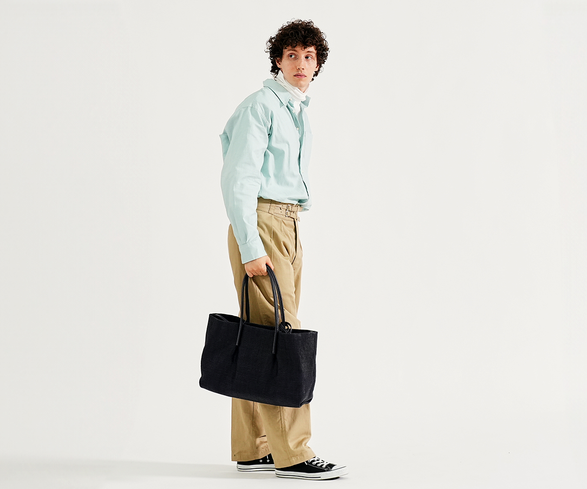 使用したのはバッファローカーフ。バッファローの丈夫さはさることながら、カーフのきめ細かく整った繊維の特性により、バッグを持ったときに、他には無い優雅で美しいドレープの表情が生まれます。