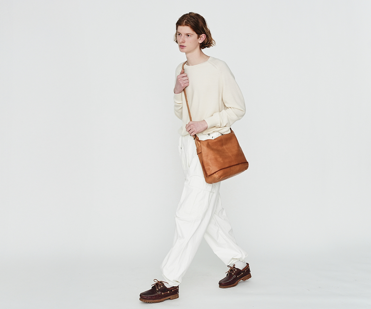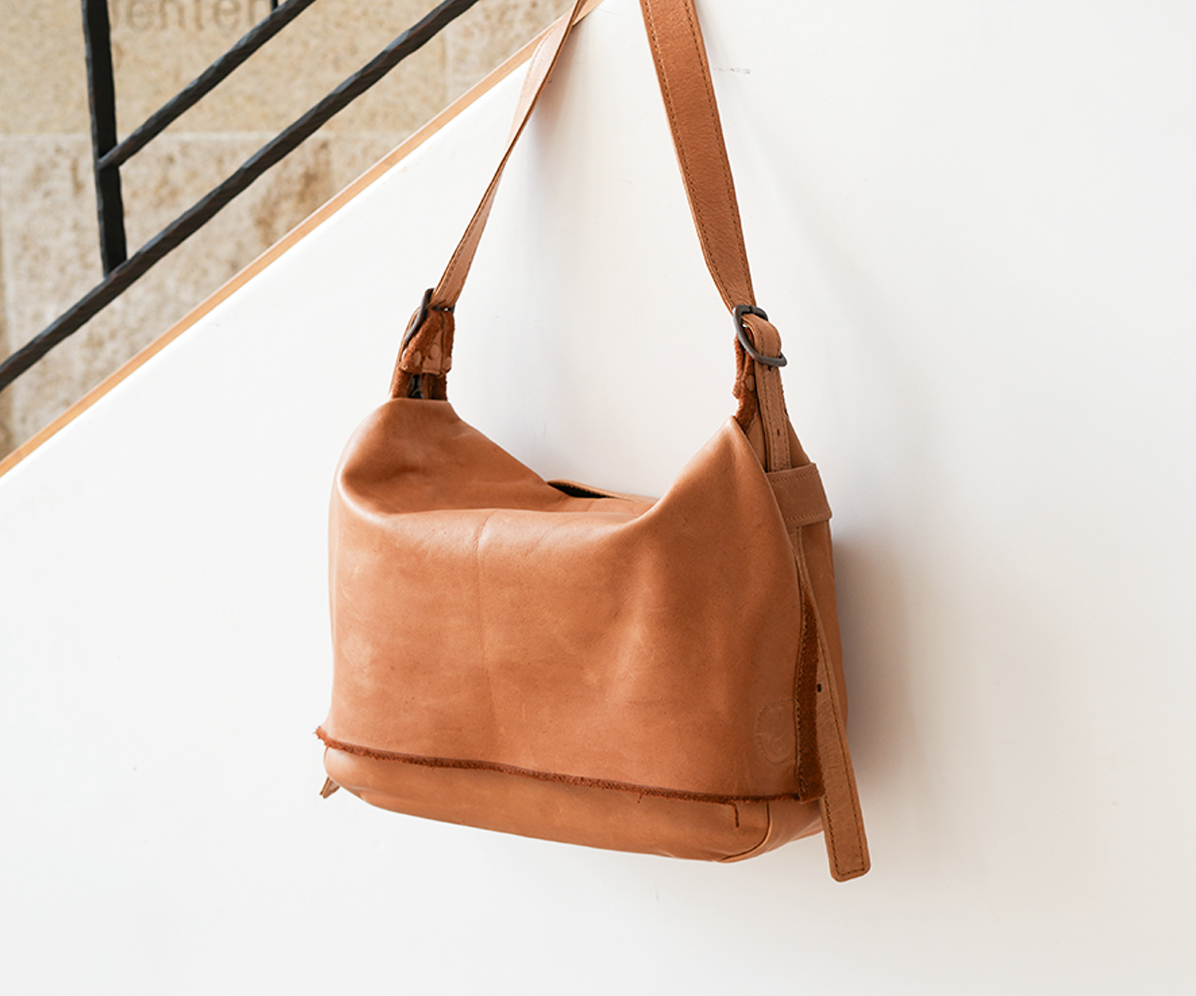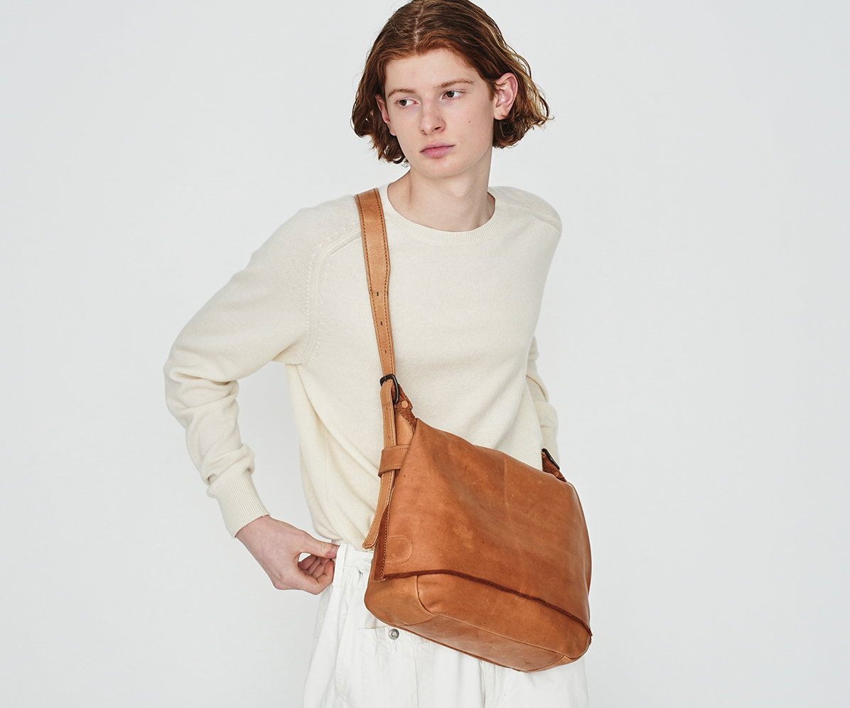 革の中と表面で染色の色を変え、キズやシミを「豊かな革の景色」として表現した、オリジナルで開発した軽量なバッグです。