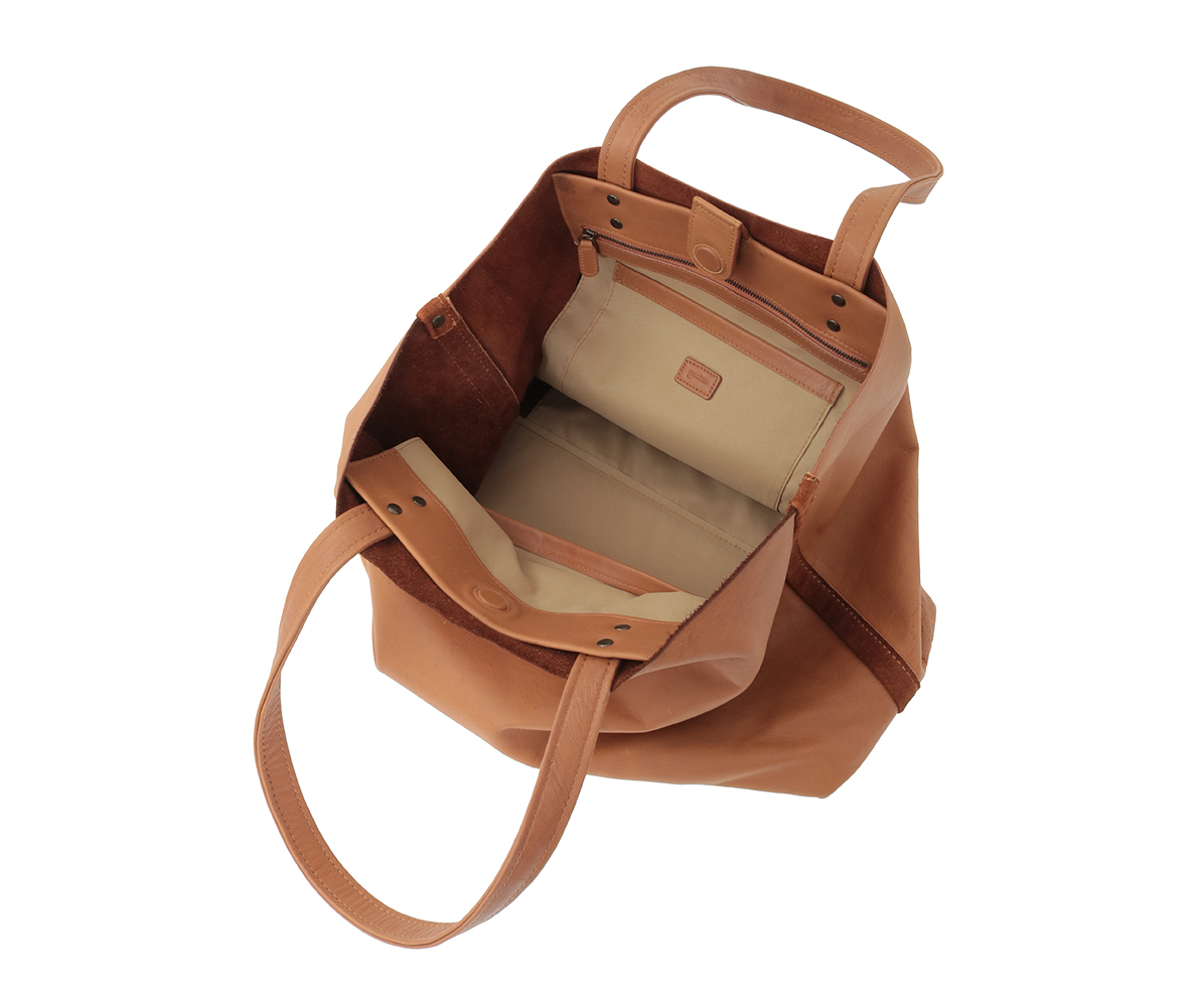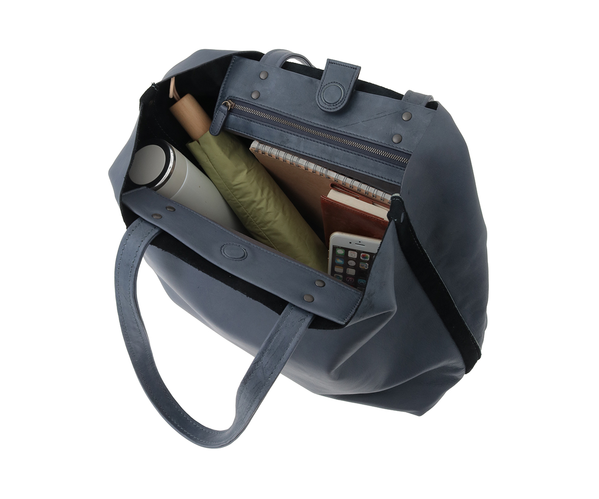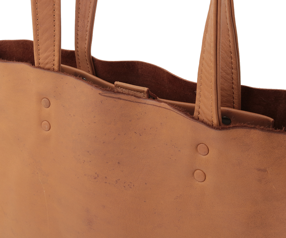 革の中と表面で染色の色を変え、キズやシミを「豊かな革の景色」として表現した、オリジナルで開発した軽量なバッグです。