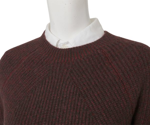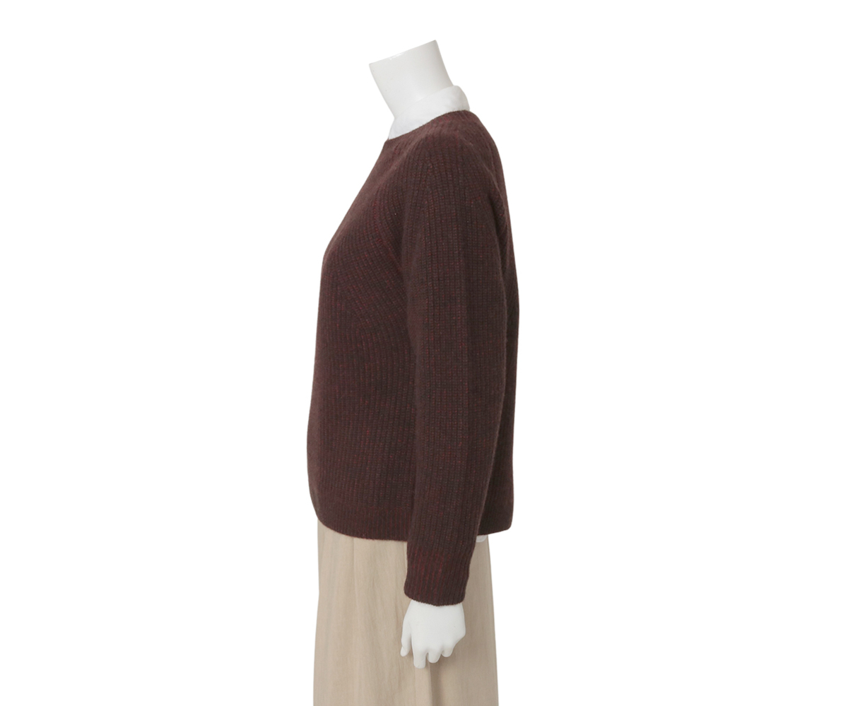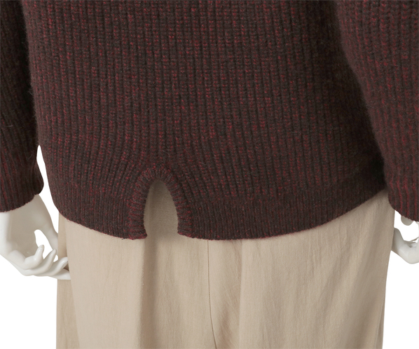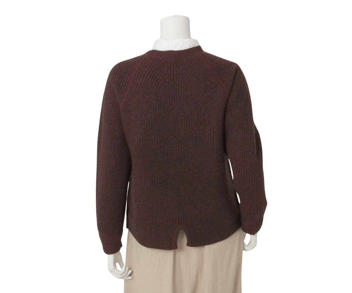 モンゴルのヤクとエキストラファインメリノウールをブレンドした糸を使ったミドルゲージの畦編みプルオーバー。