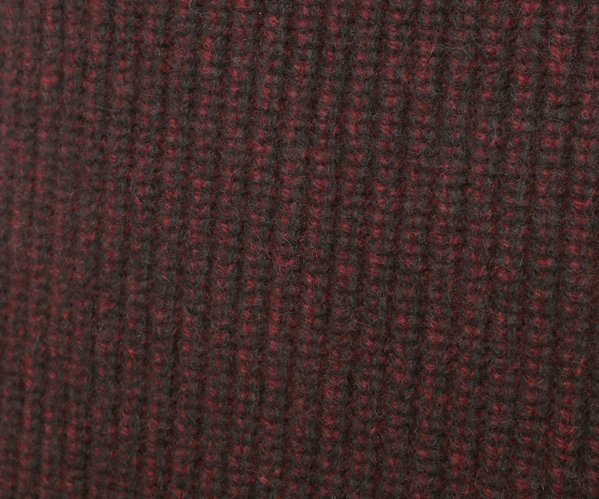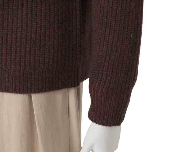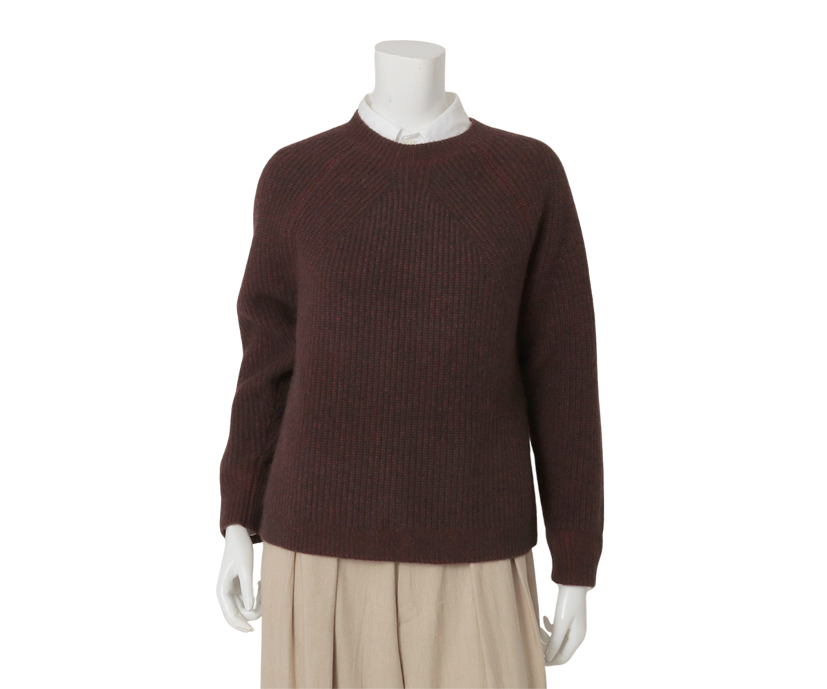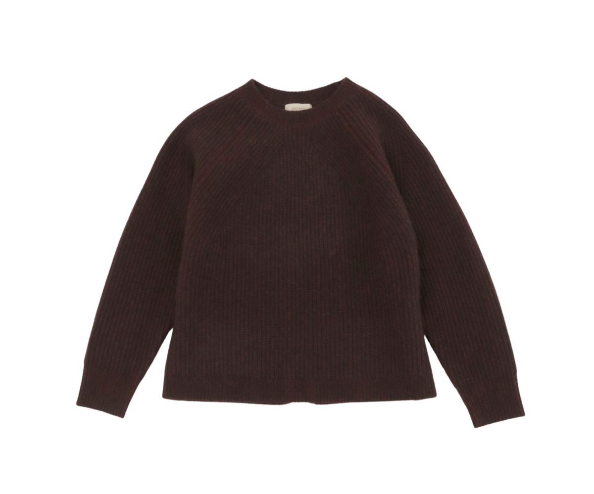 モンゴルのヤクとエキストラファインメリノウールをブレンドした糸を使ったミドルゲージの畦編みプルオーバー。