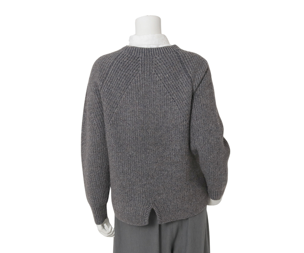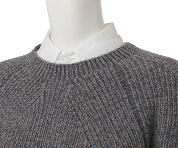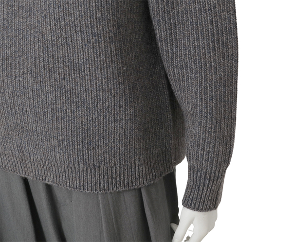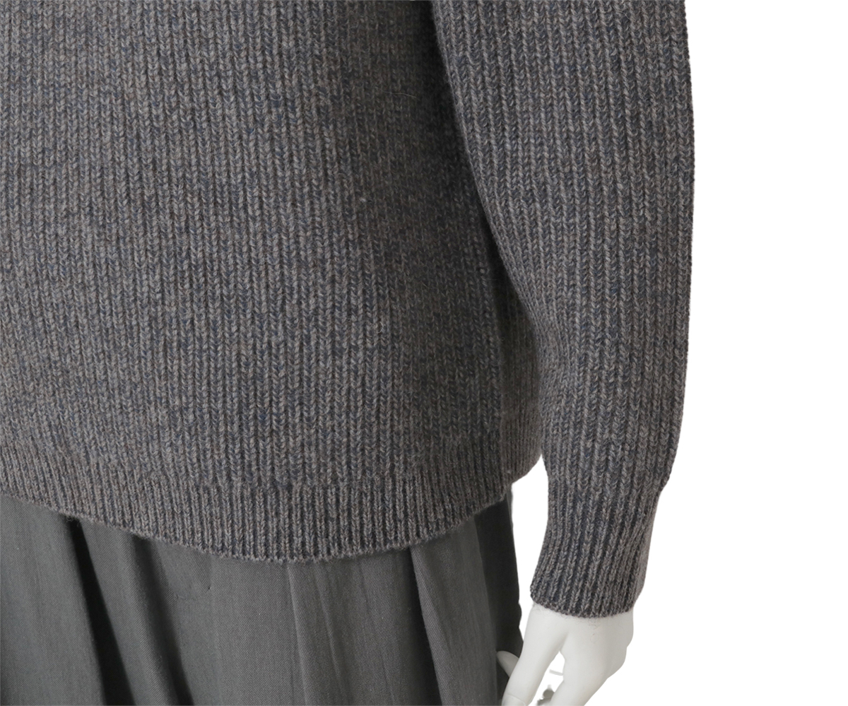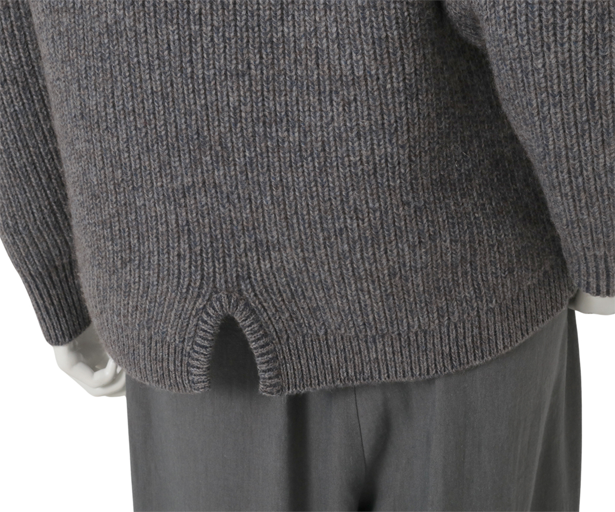 モンゴルのヤクとエキストラファインメリノウールをブレンドした糸を使ったミドルゲージの畦編みプルオーバー。