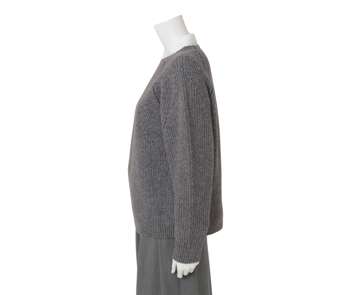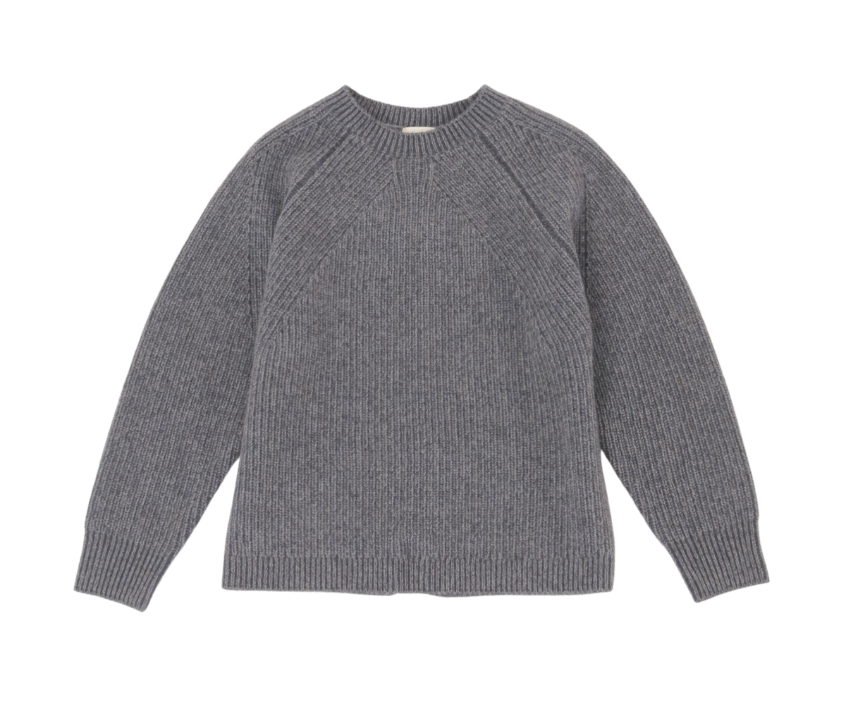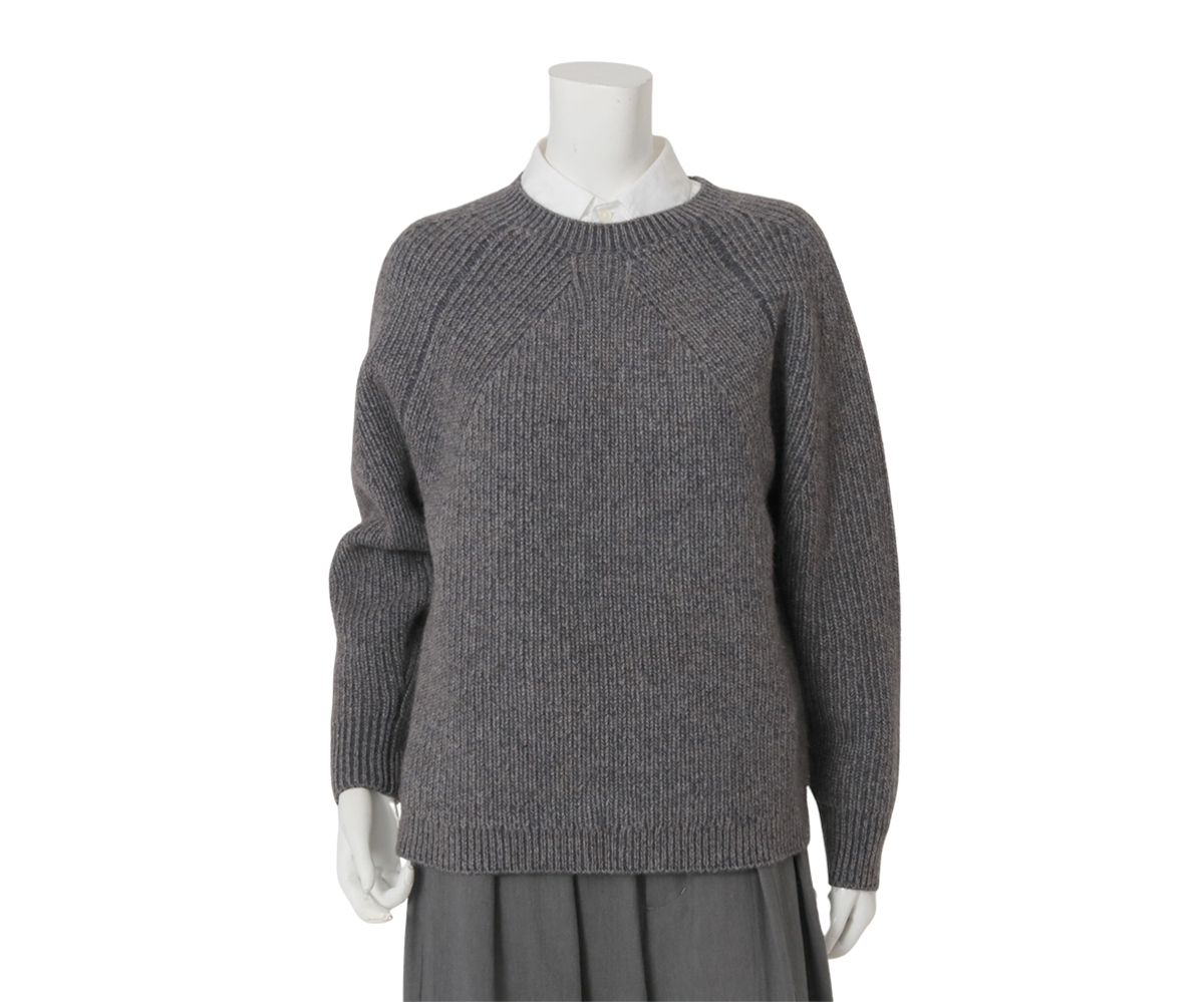 モンゴルのヤクとエキストラファインメリノウールをブレンドした糸を使ったミドルゲージの畦編みプルオーバー。