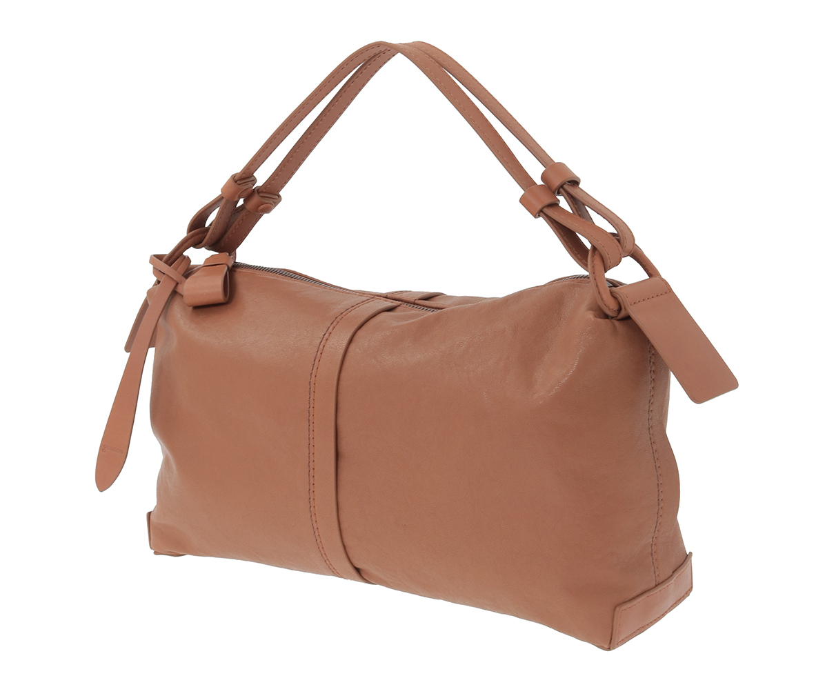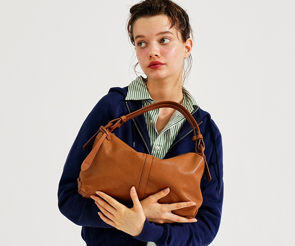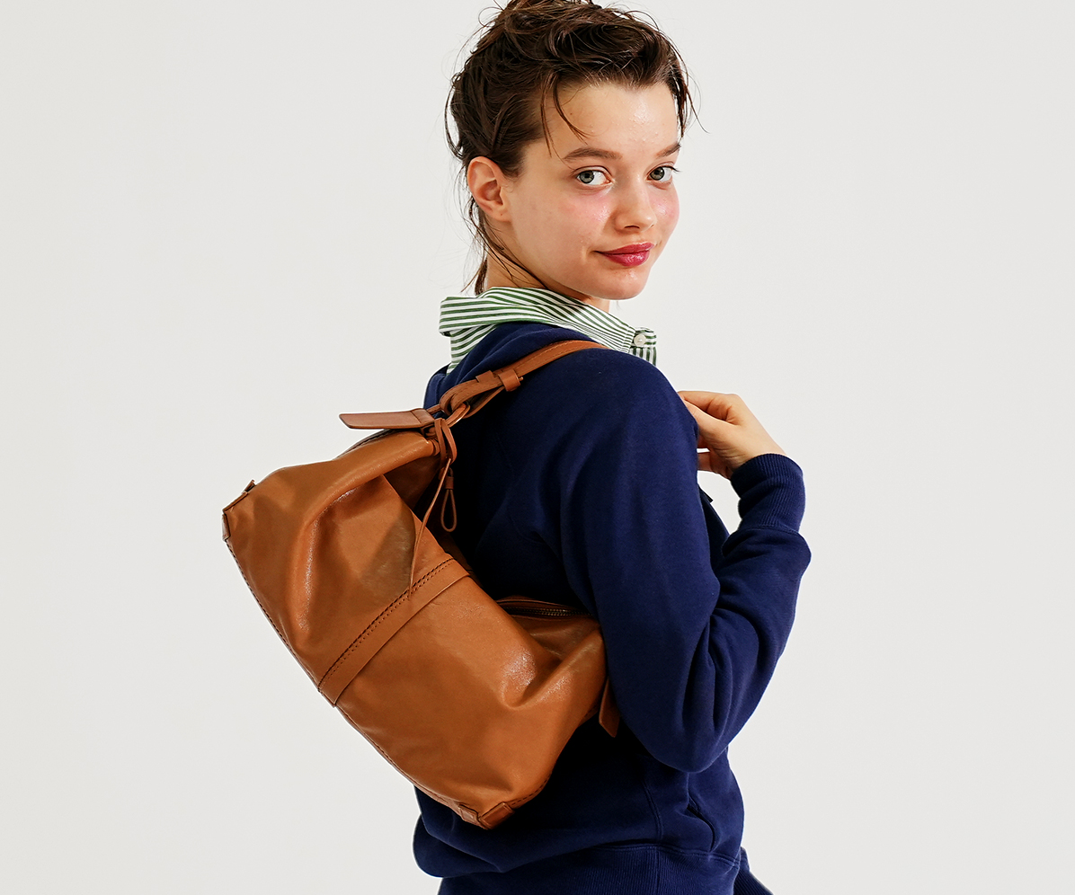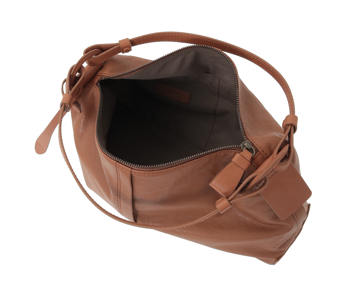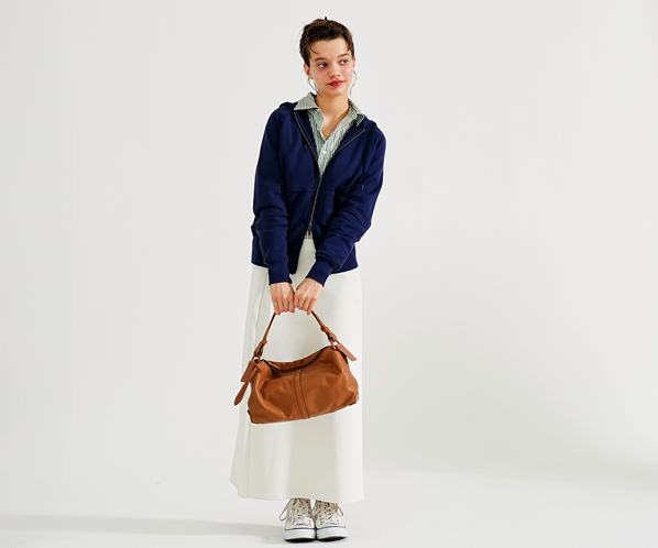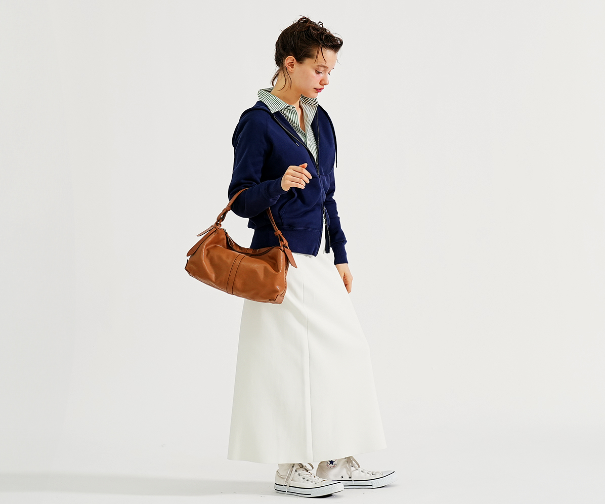 シャープなシルエットは、物を入れると丸みが出る設計。