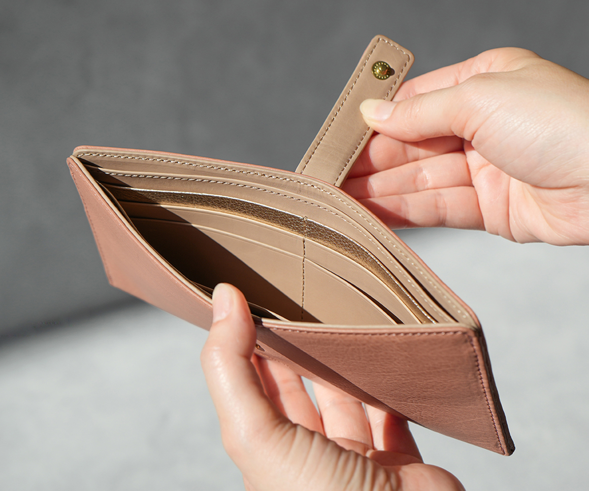 白鞣しの下地から染色をしているため、経年しても赤味が出にくく色が冷めていくのが特徴。非常に軽量で、きめ細やかな手触りをお楽しみください。