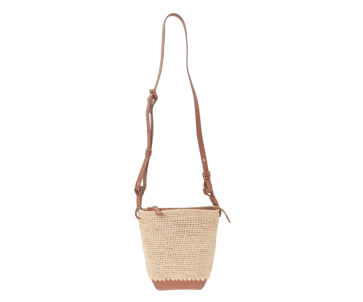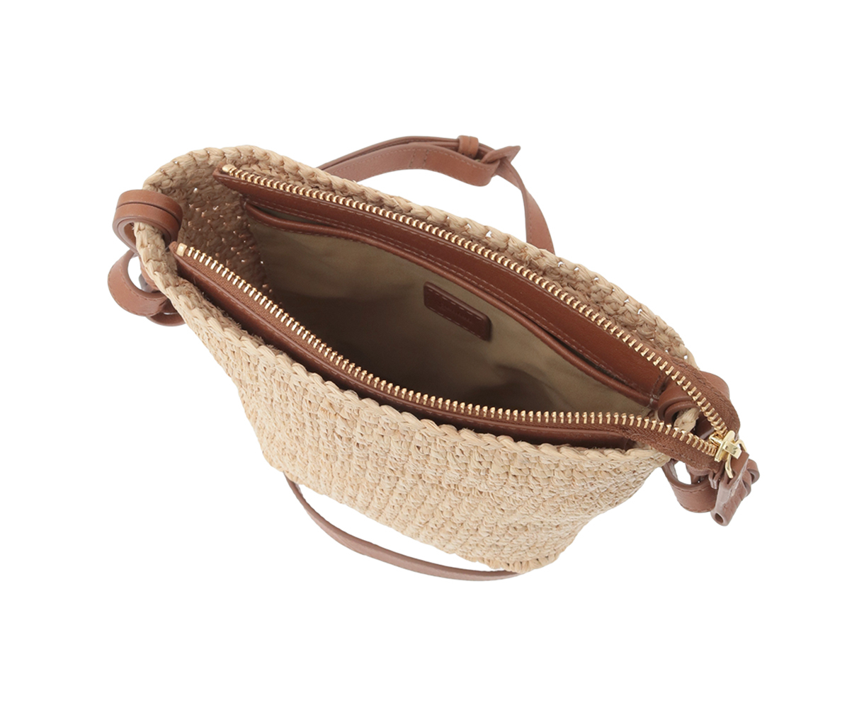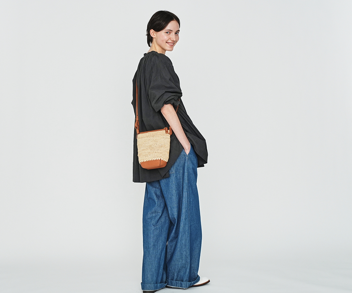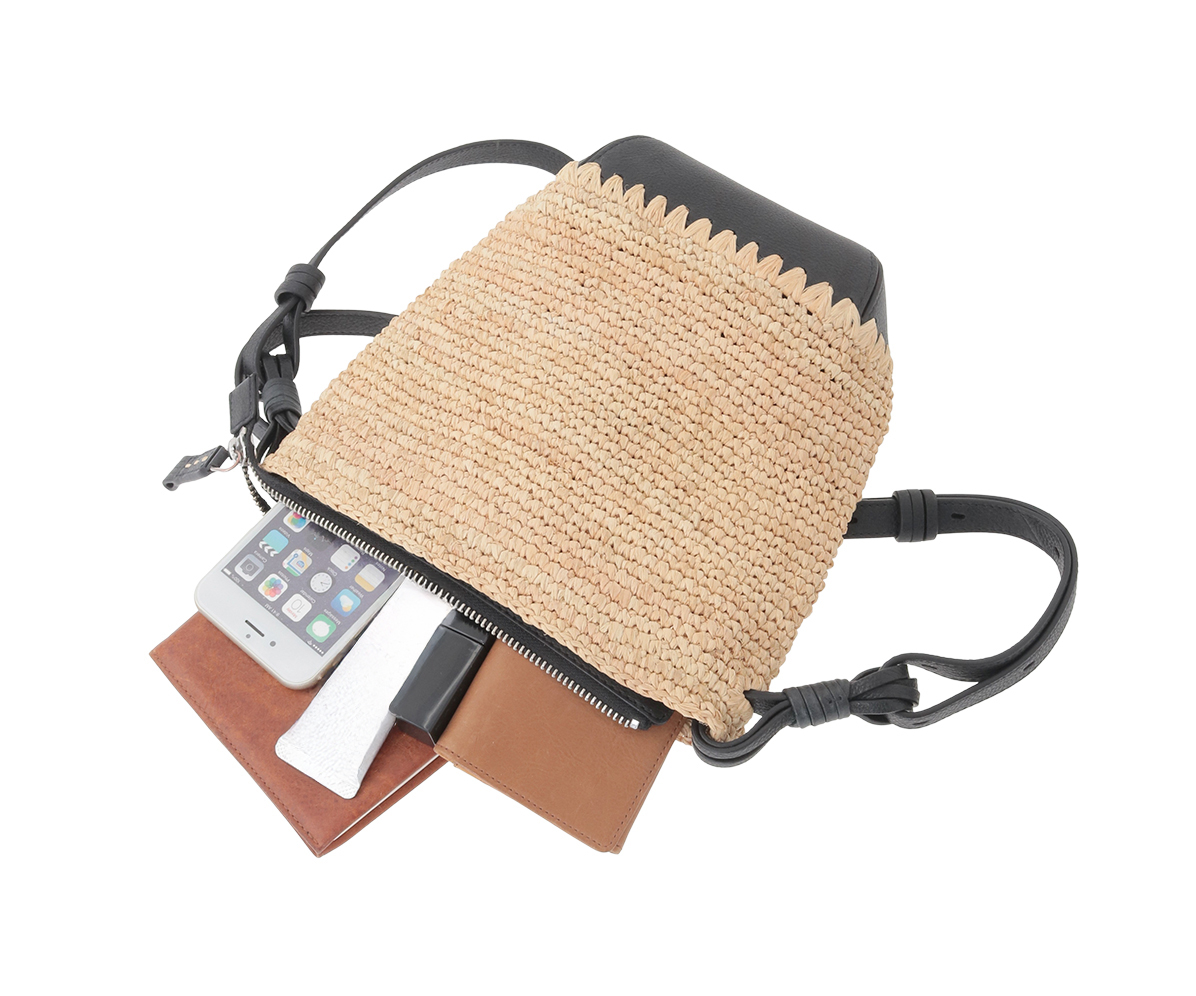 ラフィアと革を縫い合わせるのではなく、編み合わせて繋ぐことで、異素材の組み合わせも視覚的に楽しめる仕上がりです。