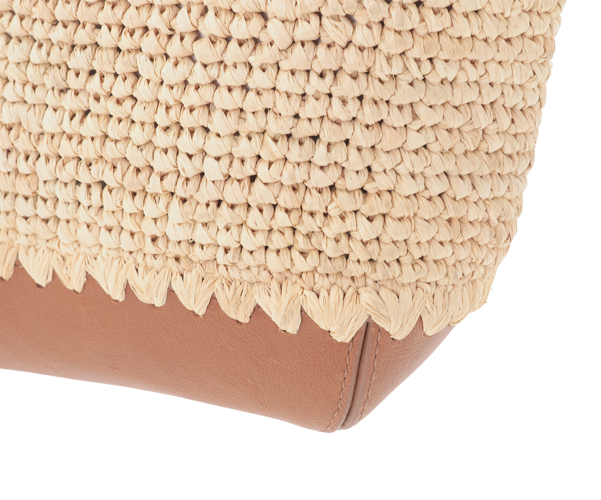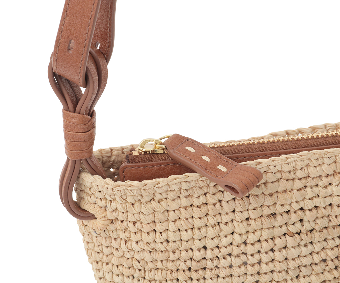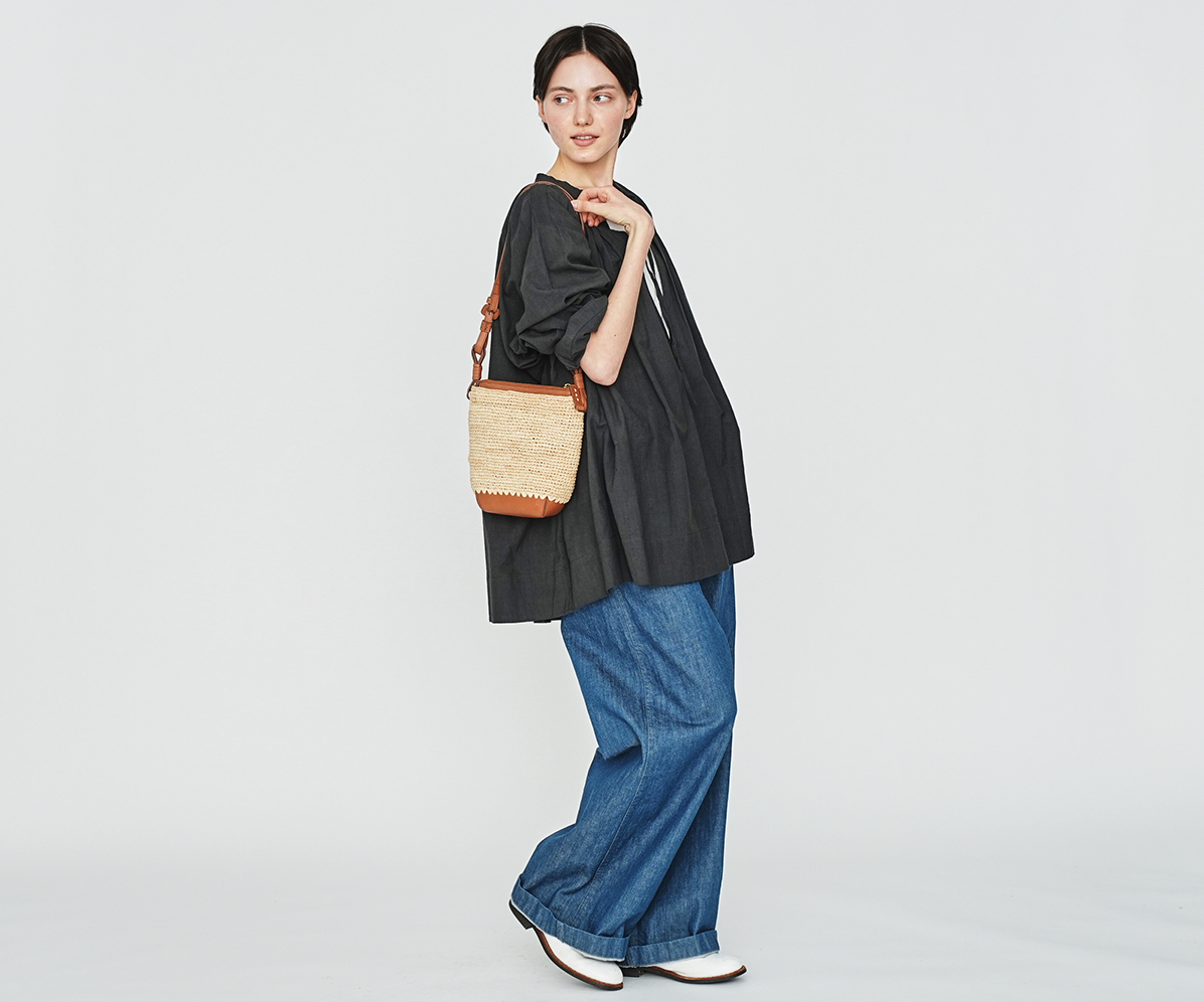 ラフィアと革を縫い合わせるのではなく、編み合わせて繋ぐことで、異素材の組み合わせも視覚的に楽しめる仕上がりです。