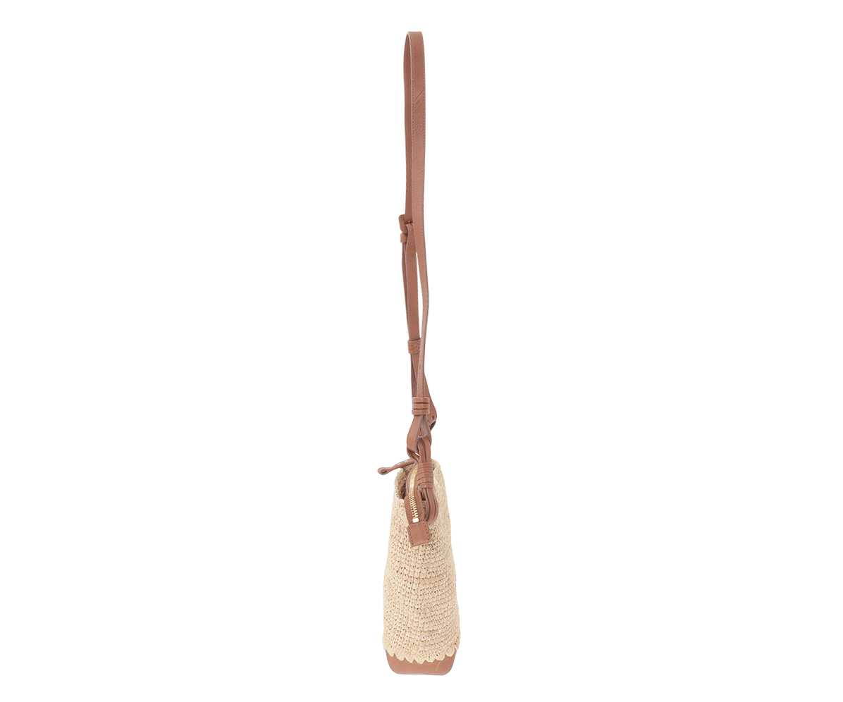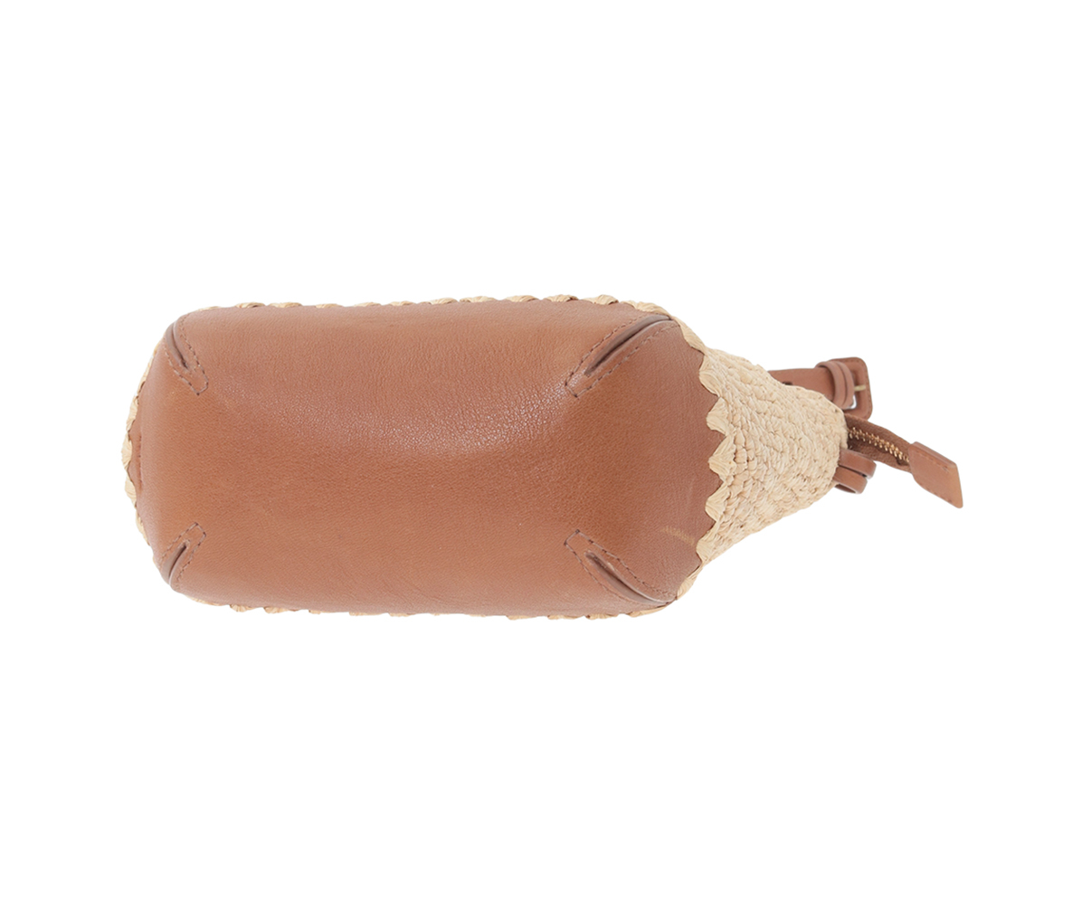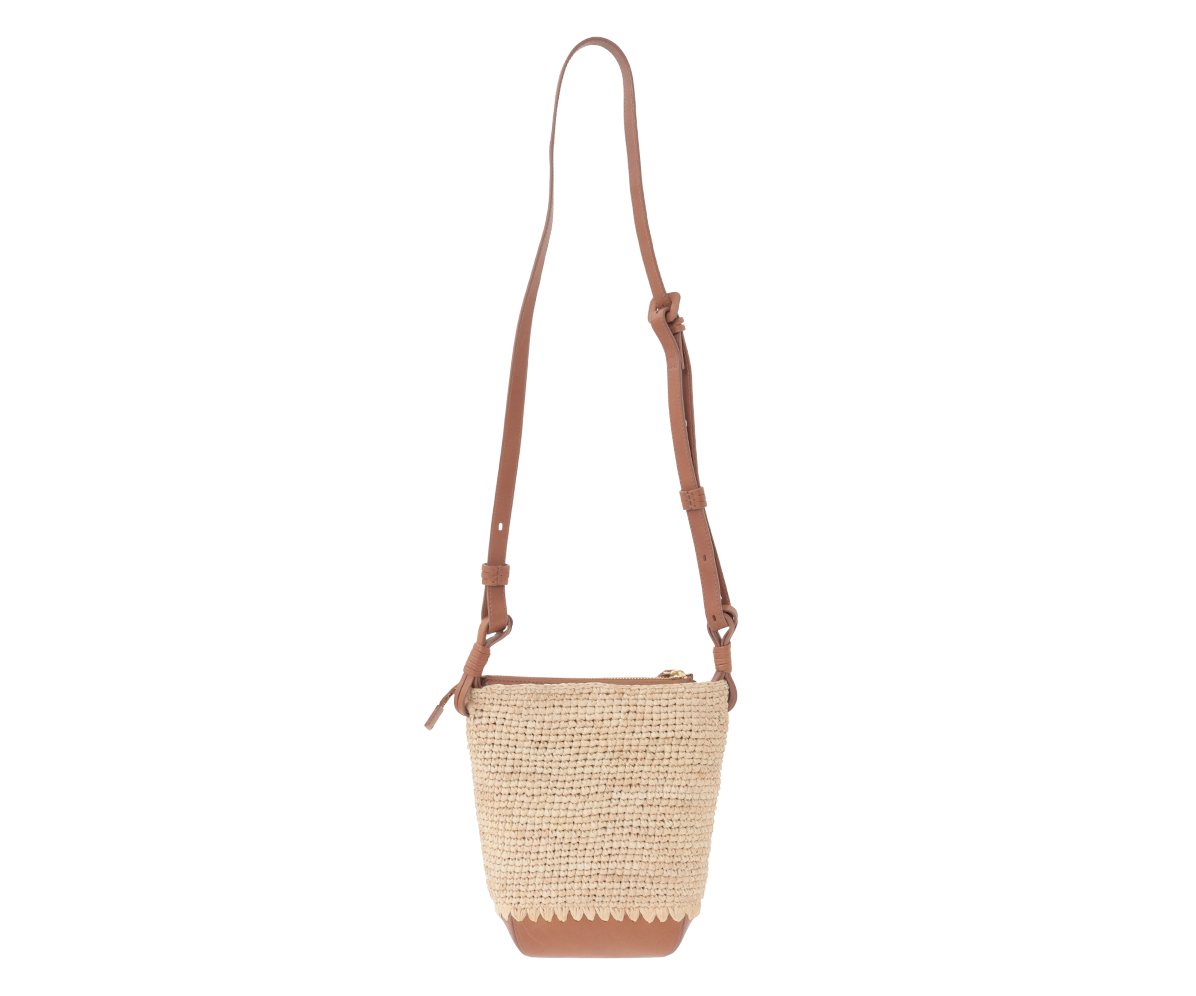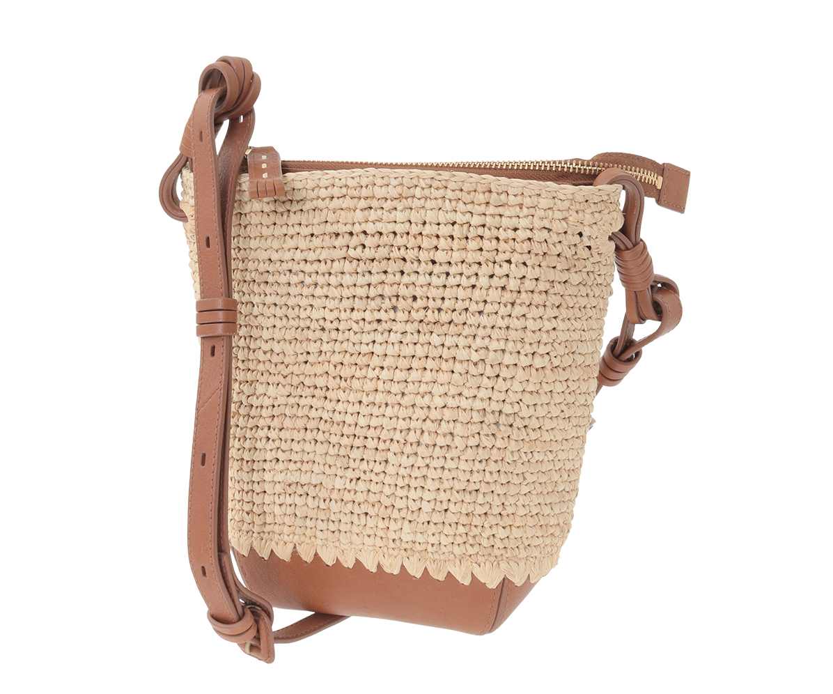 ラフィアと革を縫い合わせるのではなく、編み合わせて繋ぐことで、異素材の組み合わせも視覚的に楽しめる仕上がりです。
