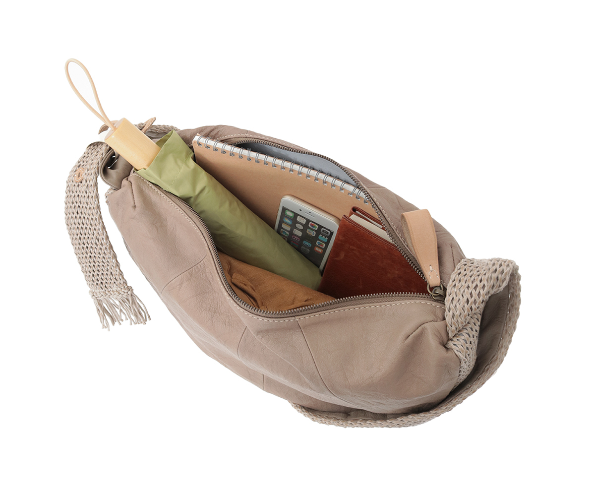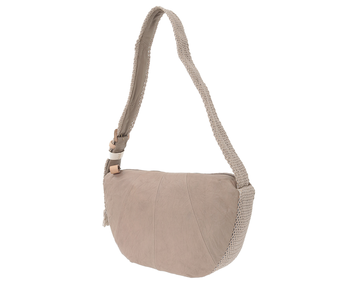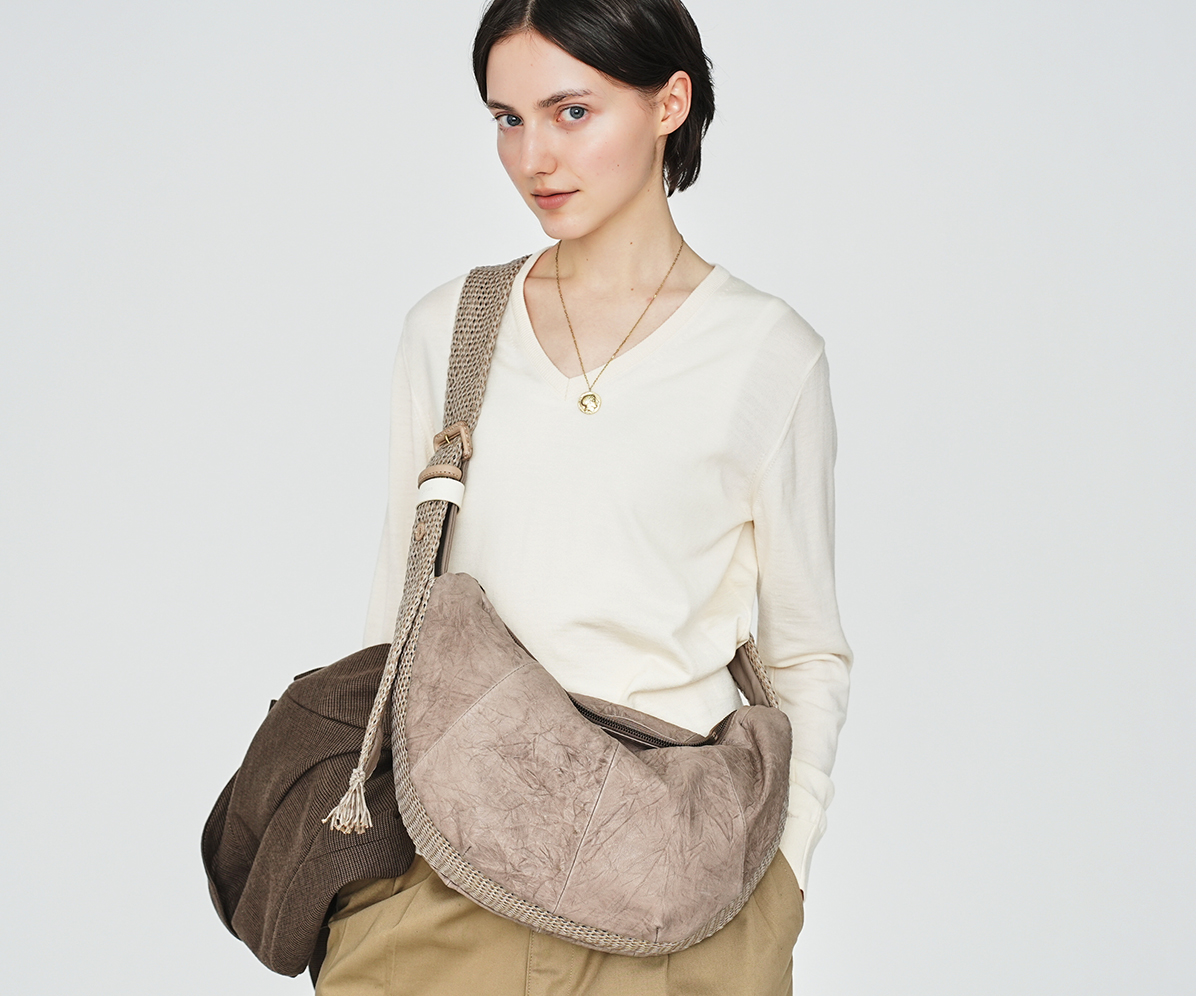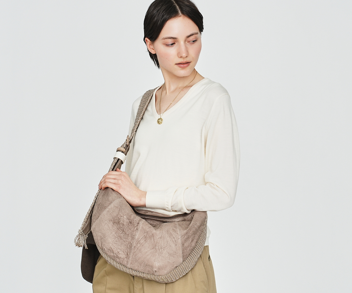 手絞りによるシワ加工を施した表情豊かな革と、繊細に編み込まれたメッシュを組み合わせた、深みと軽やかさを併せ持つ、春夏に相応しいカジュアルバッグ。