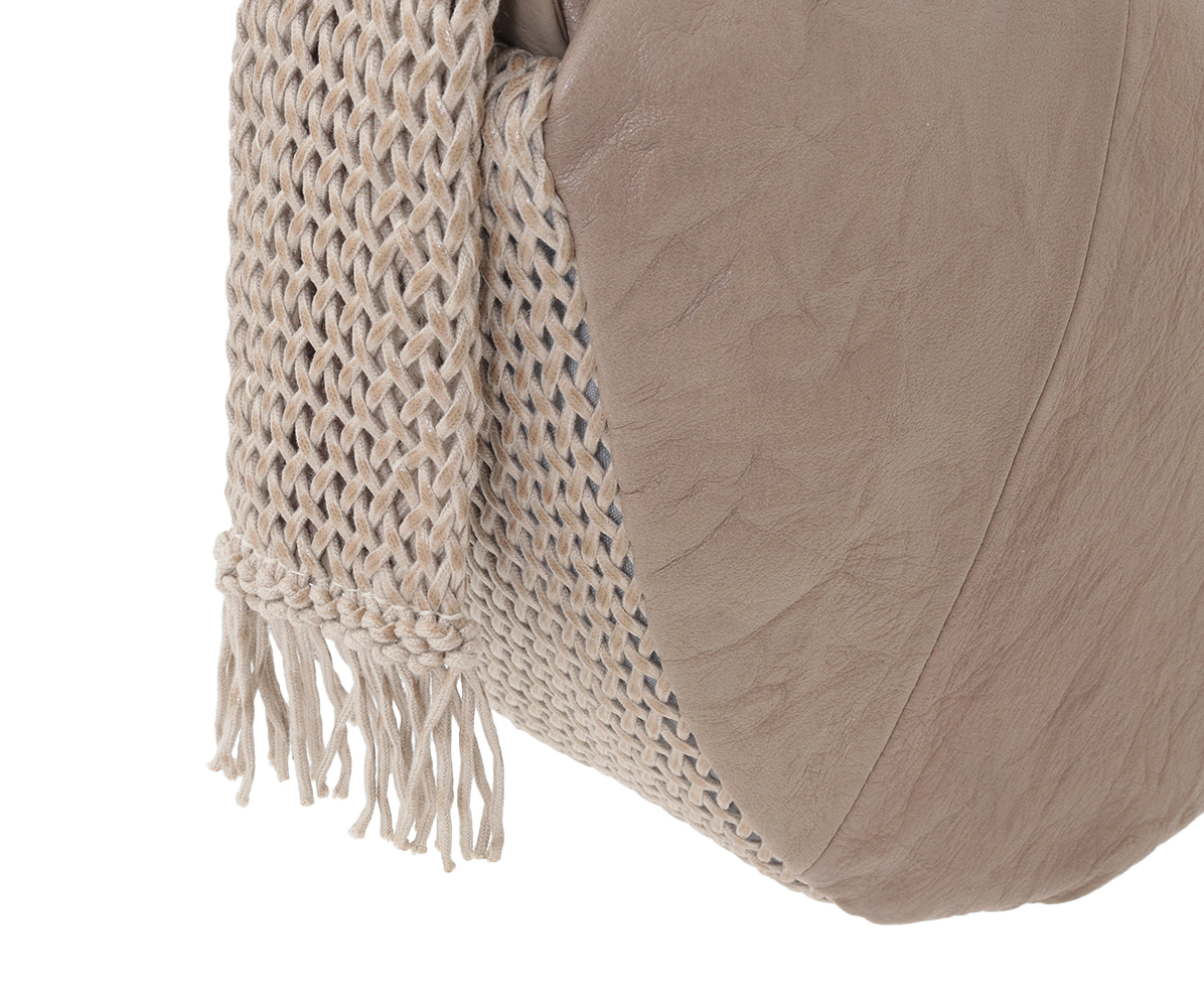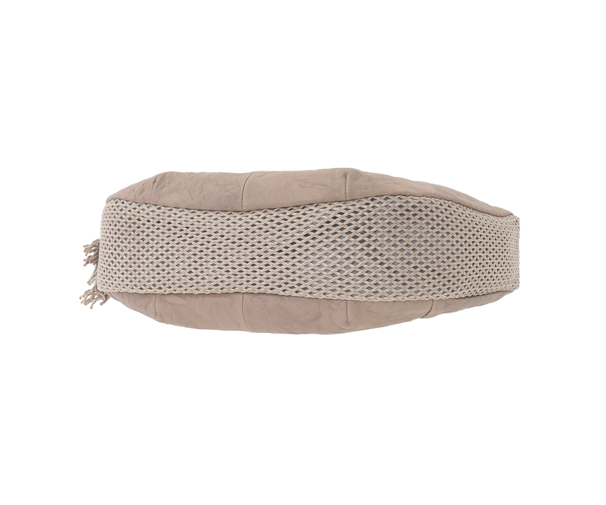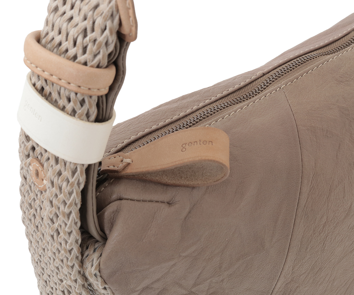 手絞りによるシワ加工を施した表情豊かな革と、繊細に編み込まれたメッシュを組み合わせた、深みと軽やかさを併せ持つ、春夏に相応しいカジュアルバッグ。