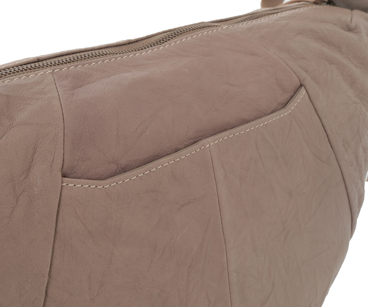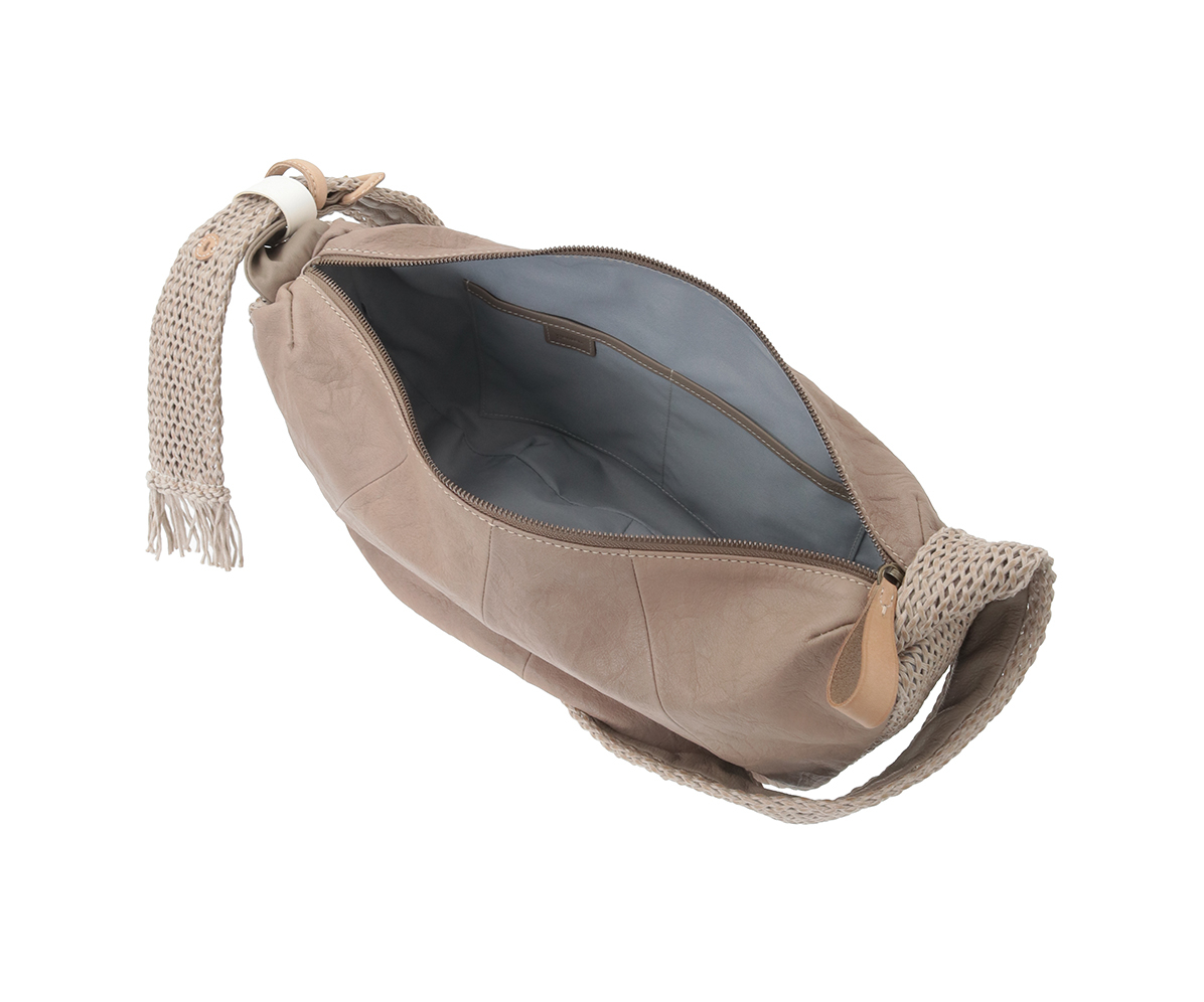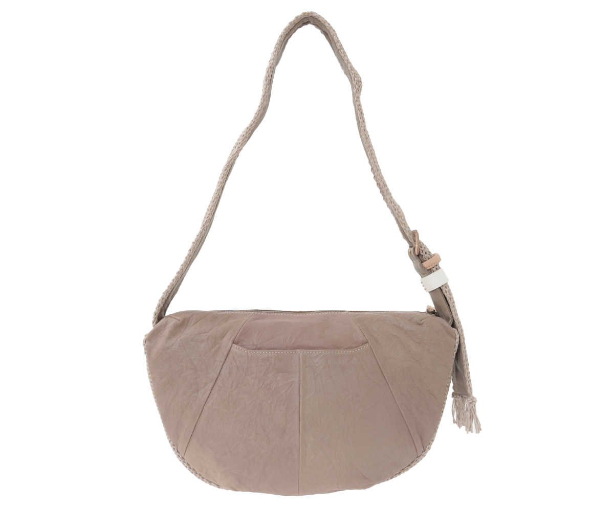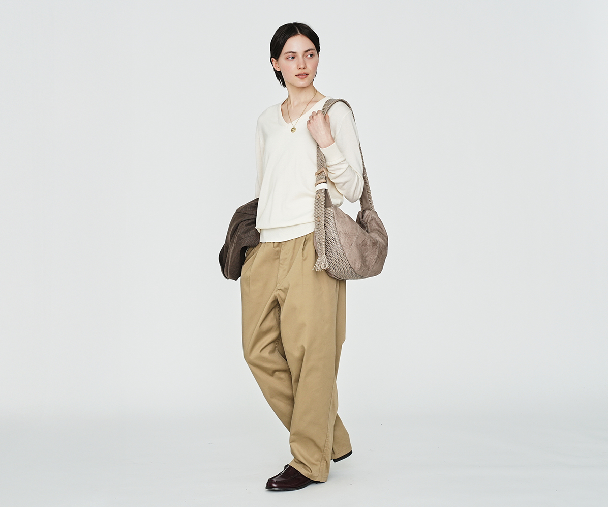 手絞りによるシワ加工を施した表情豊かな革と、繊細に編み込まれたメッシュを組み合わせた、深みと軽やかさを併せ持つ、春夏に相応しいカジュアルバッグ。