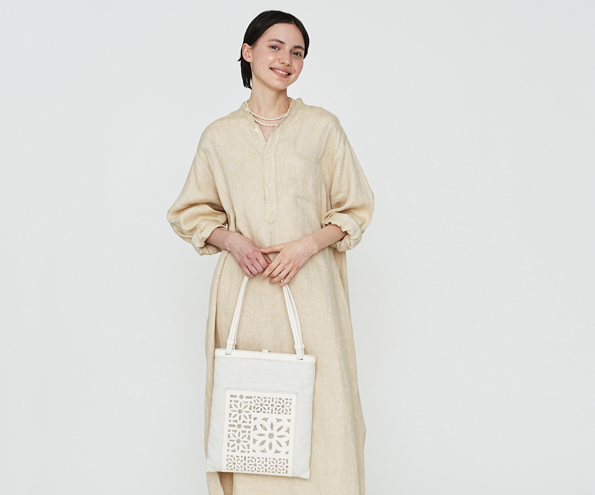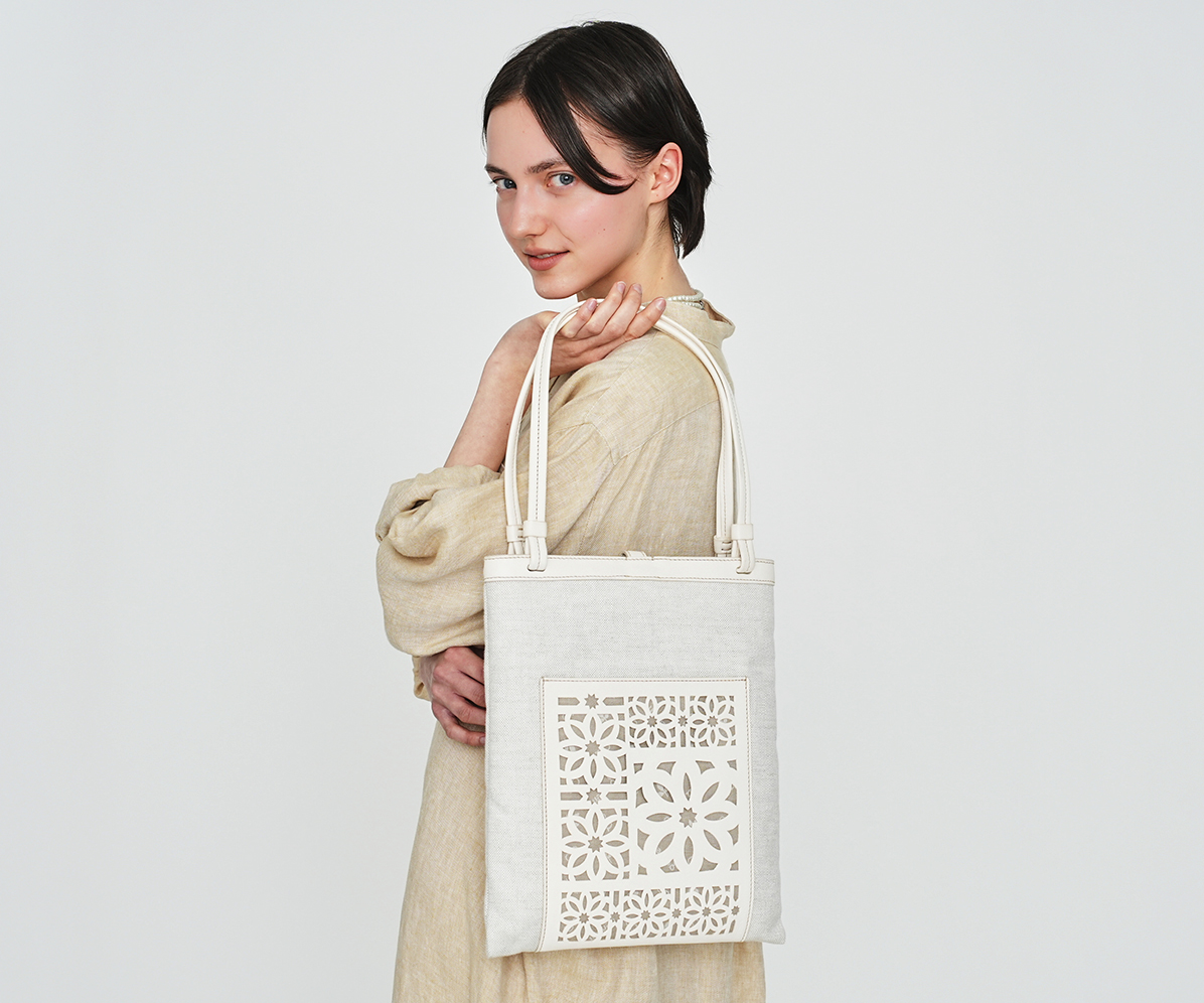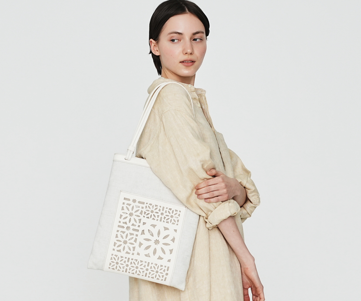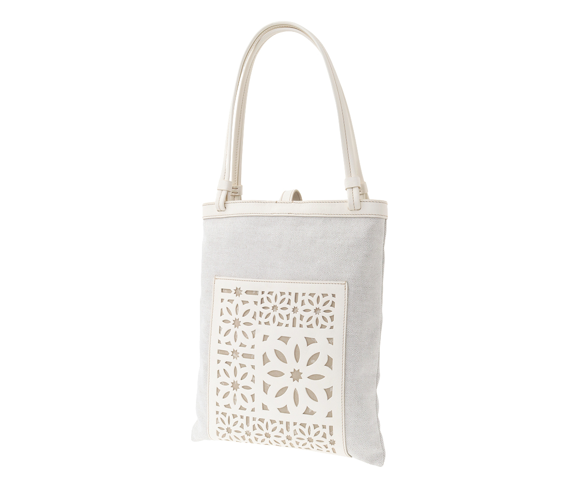 革にはゲンテンのシグネチャー素材であるミネルヴァボックスをあしらい、前面のポケットには花模様のカッティングを施して、軽快かつ上品な印象に仕上げました。