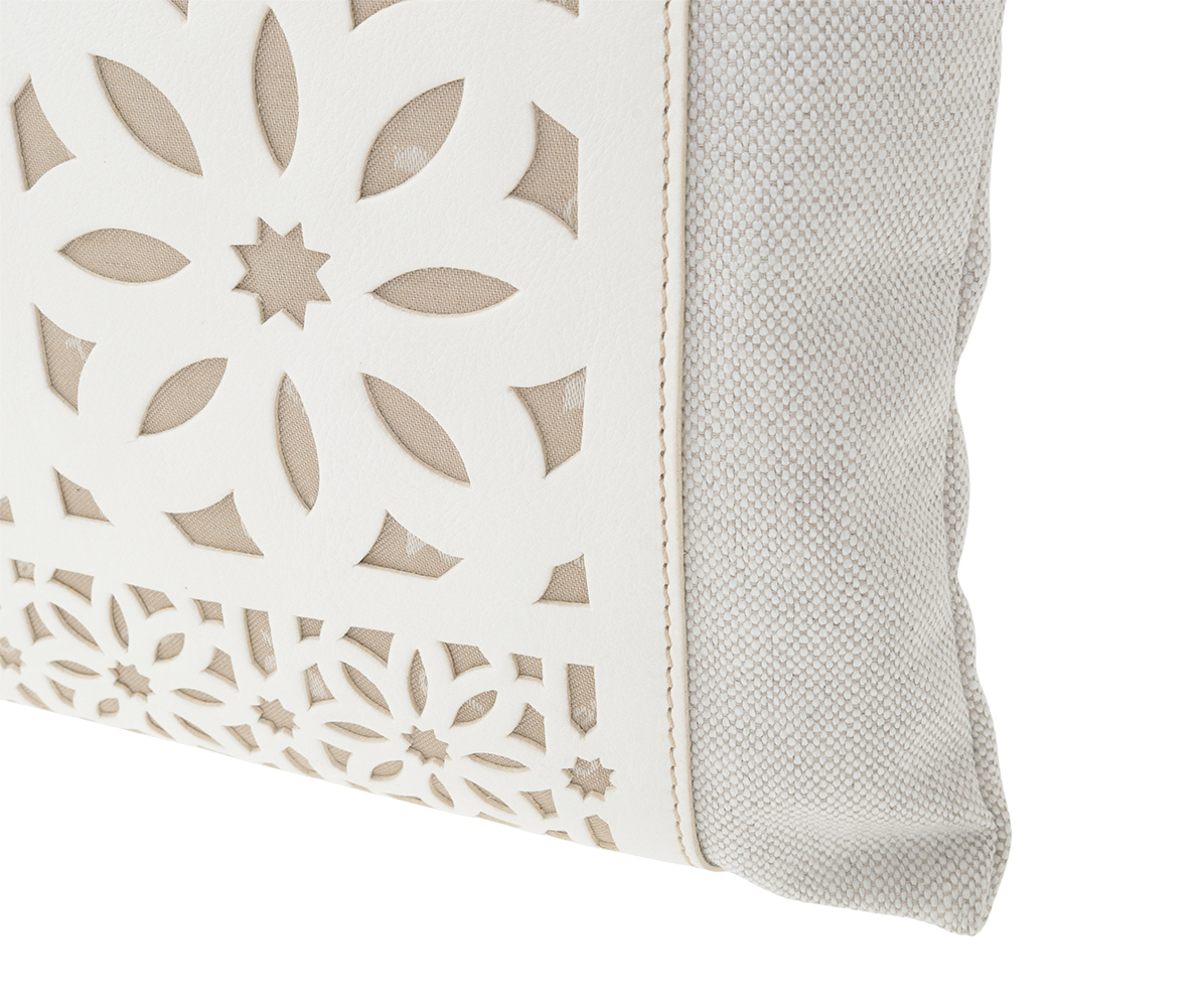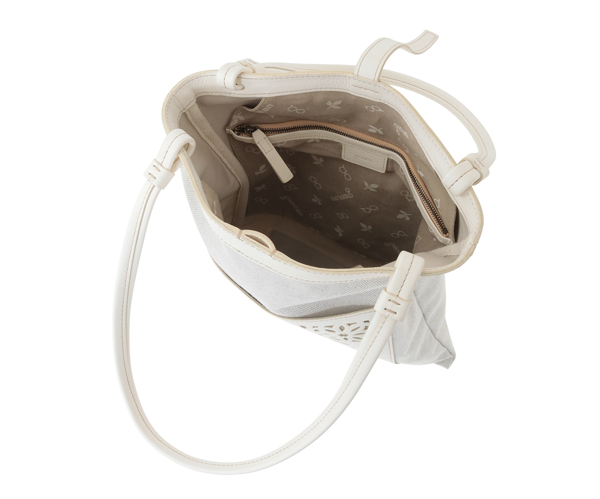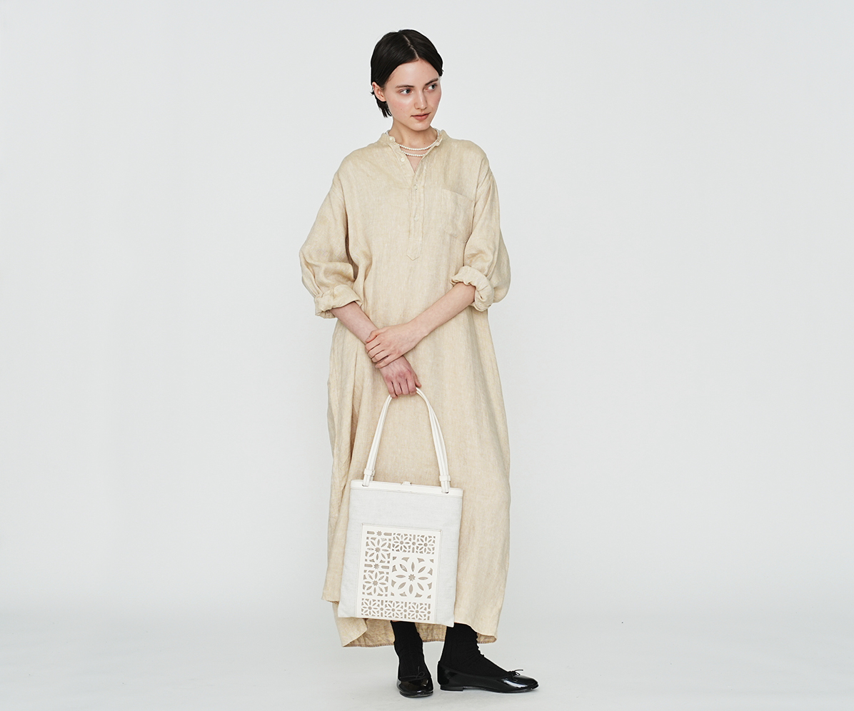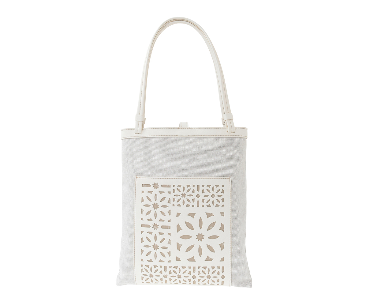 革にはゲンテンのシグネチャー素材であるミネルヴァボックスをあしらい、前面のポケットには花模様のカッティングを施して、軽快かつ上品な印象に仕上げました。