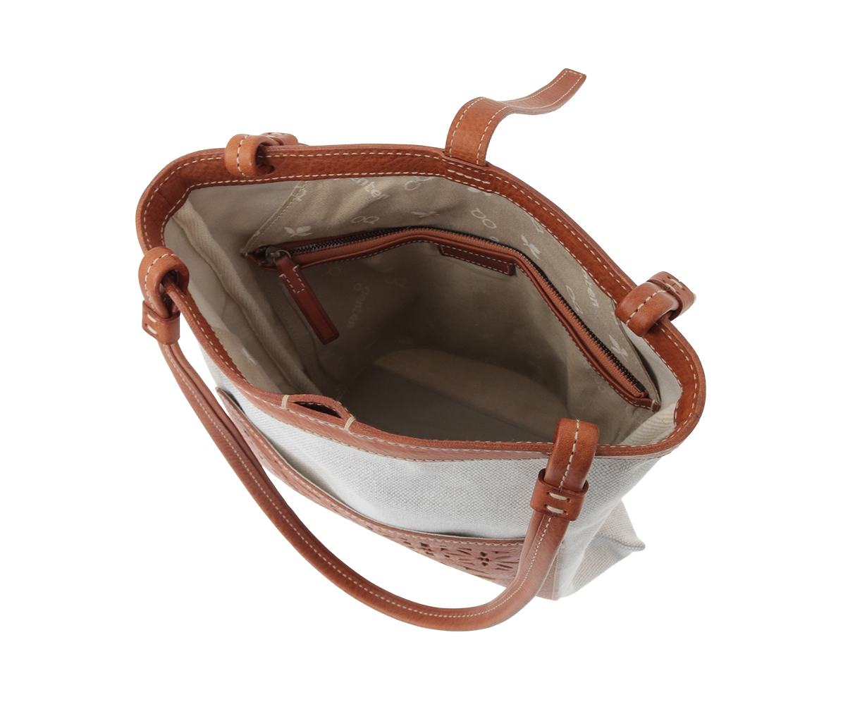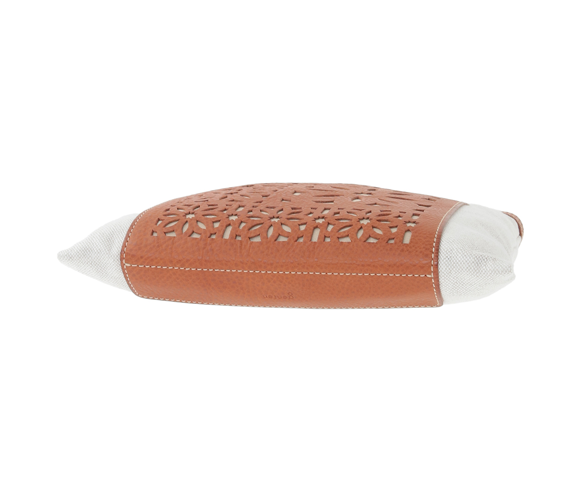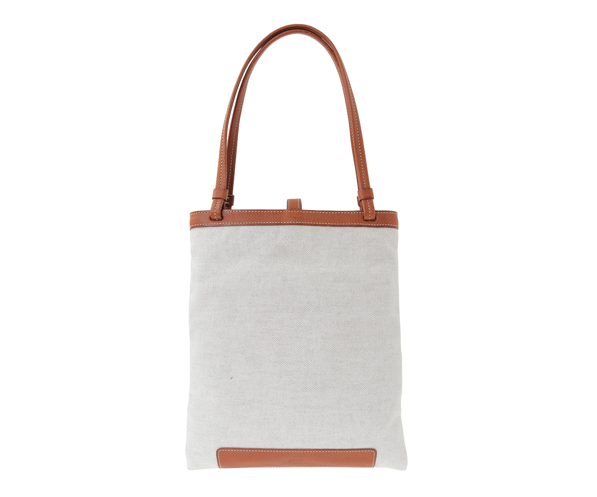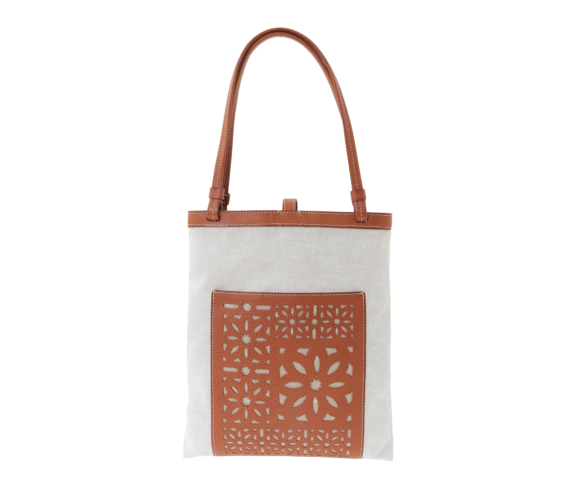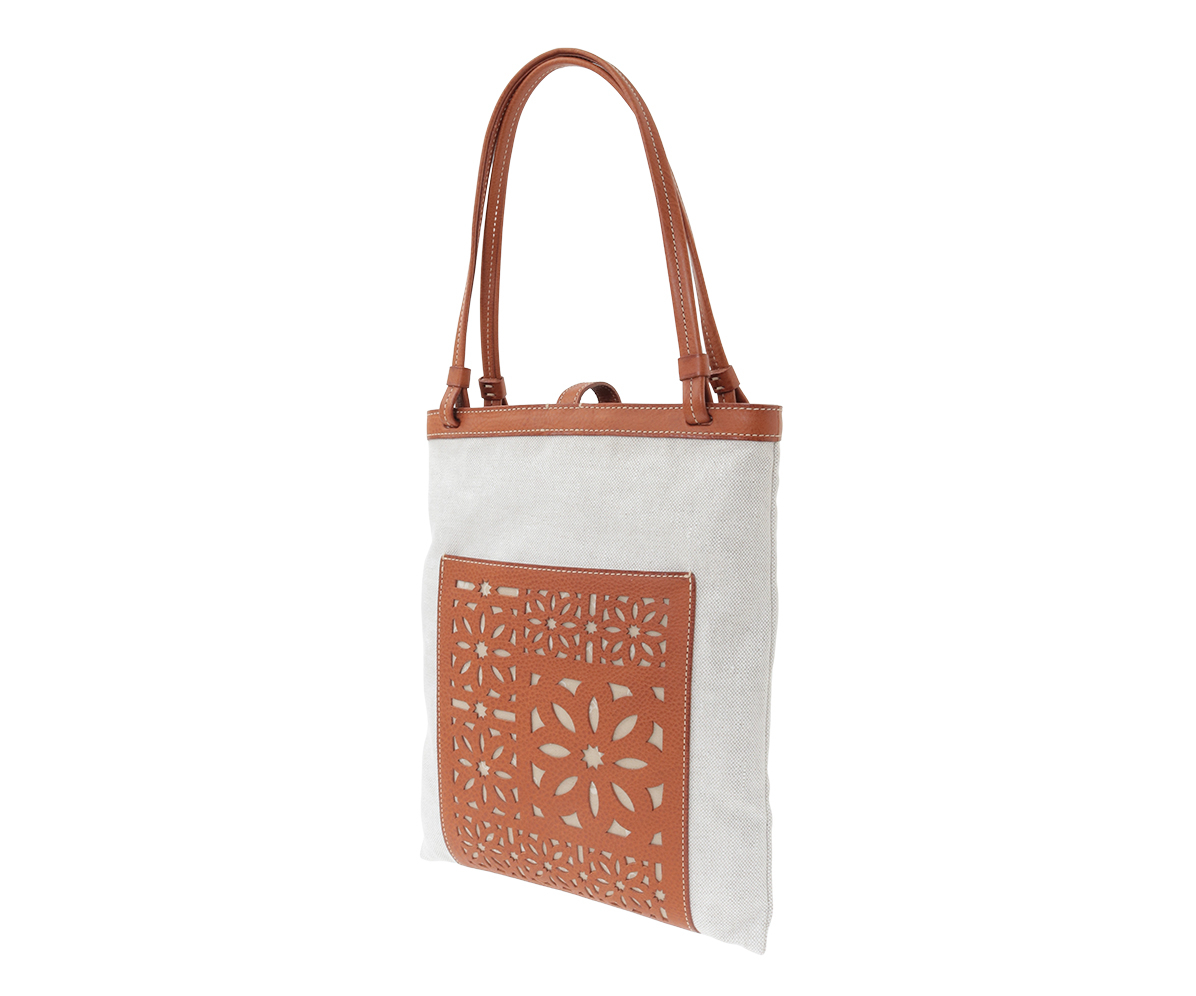 革にはゲンテンのシグネチャー素材であるミネルヴァボックスをあしらい、前面のポケットには花模様のカッティングを施して、軽快かつ上品な印象に仕上げました。
