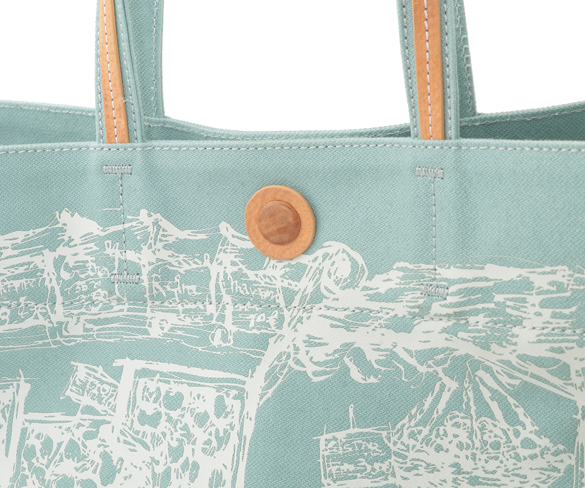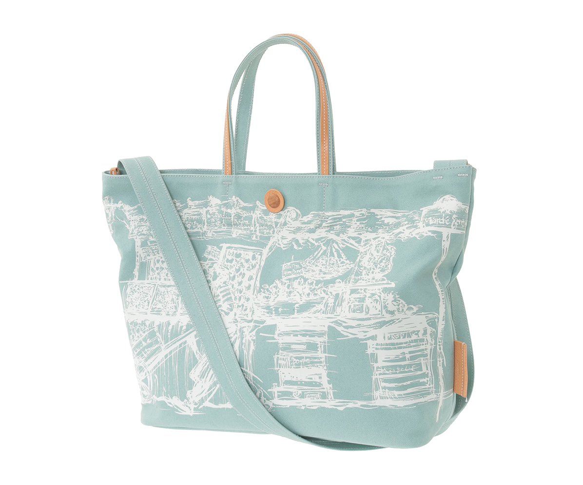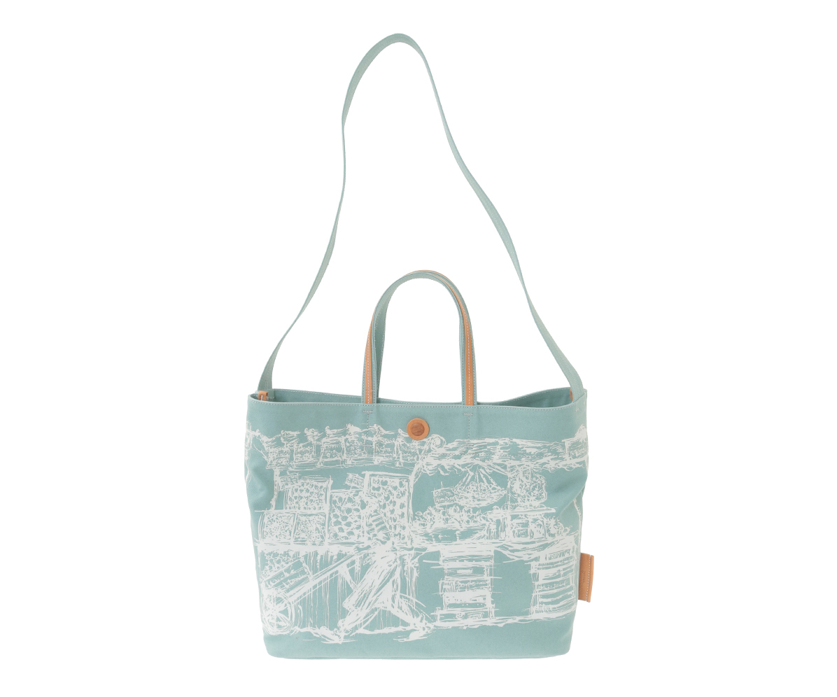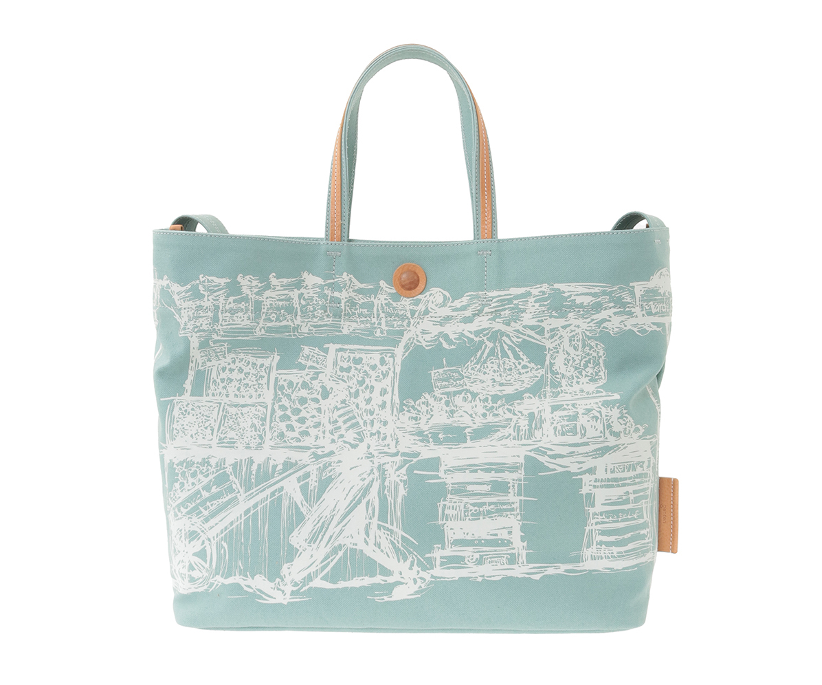 青空市場の活気ある風景をプリントしたブロークンツイルの2wayキャンバスバッグ。