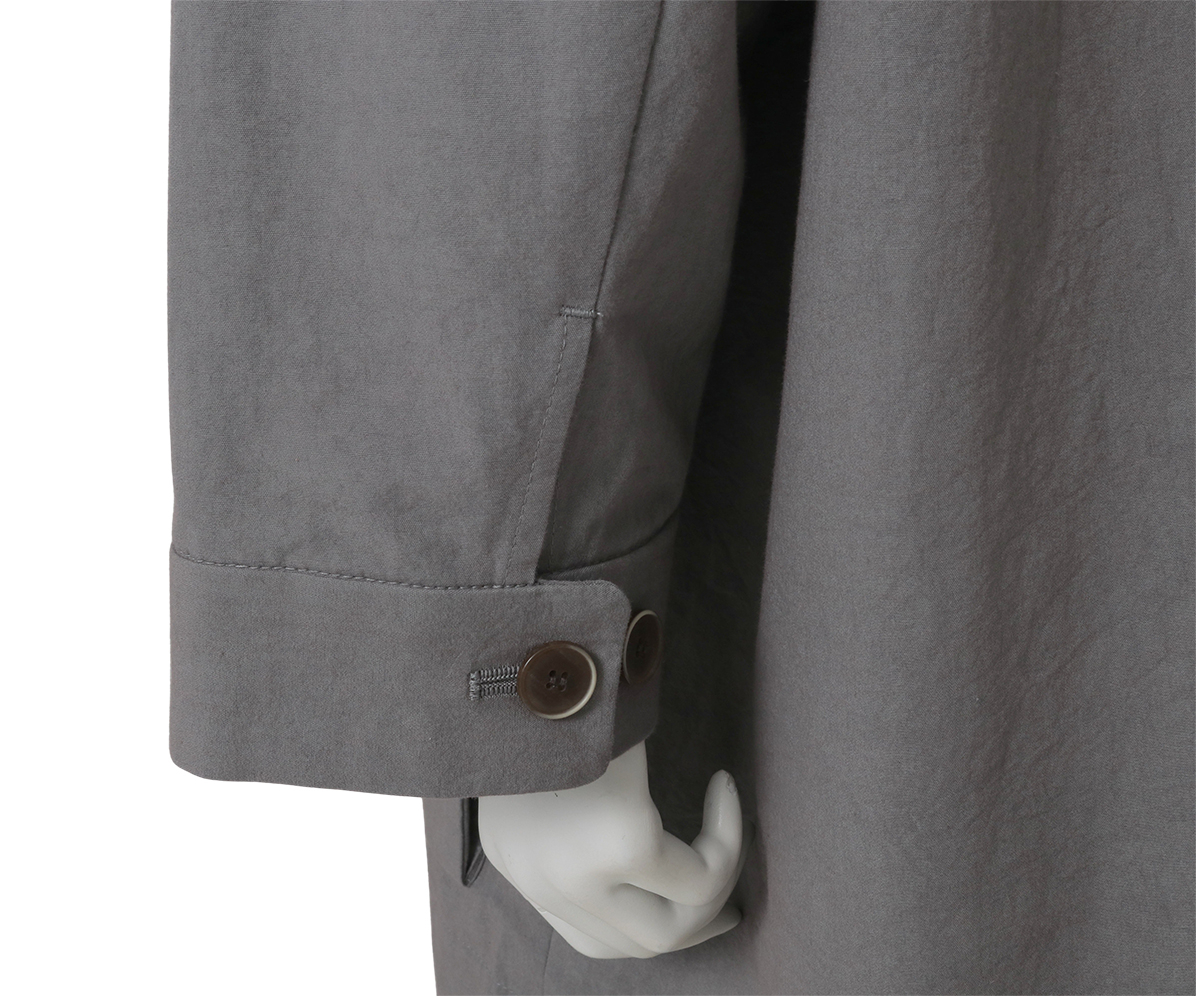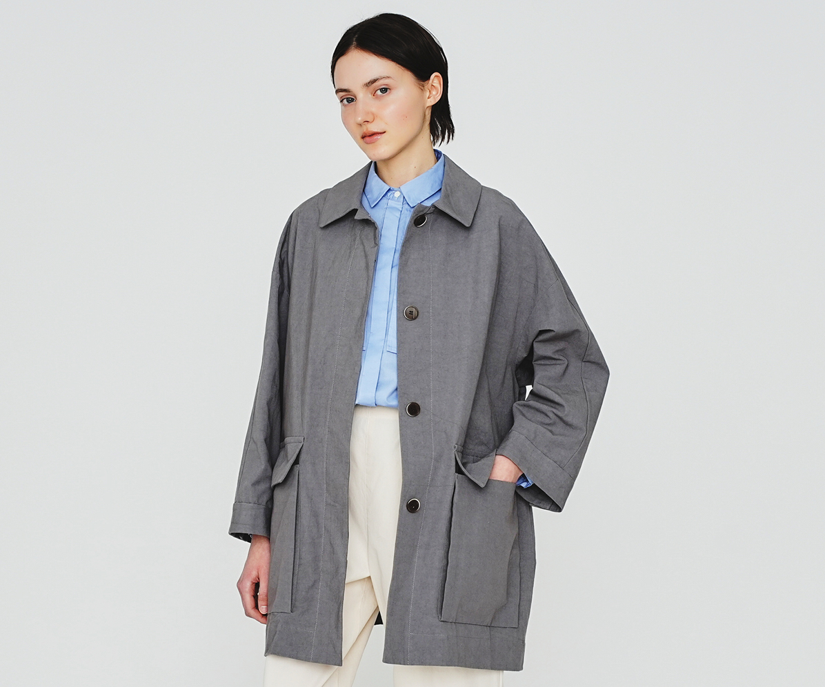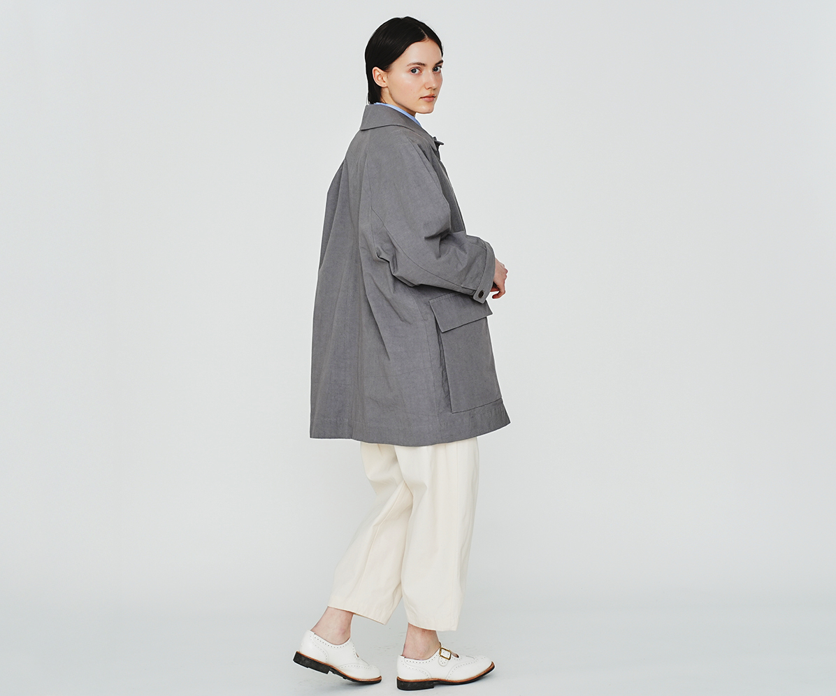 カバーオールタイプのハーフコートはワーク調でありながら比翼始末ですっきりと、大きいマチ付きポケットがポイントです。