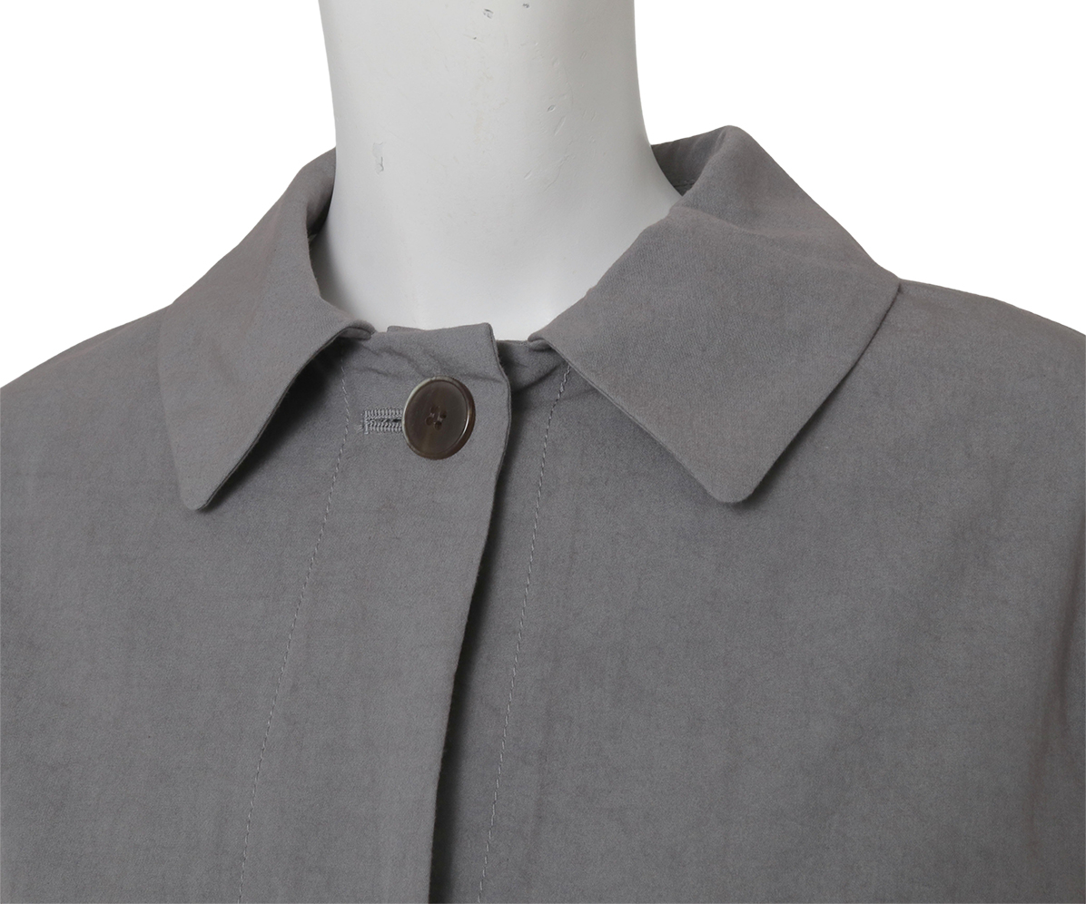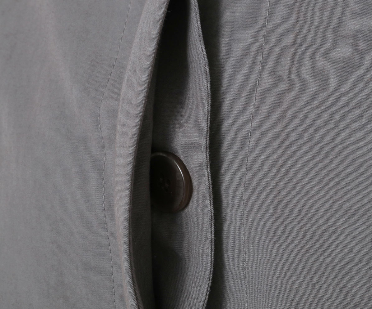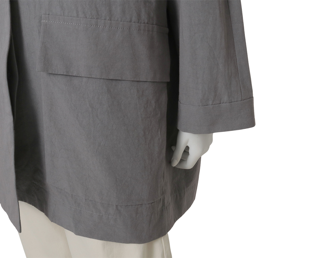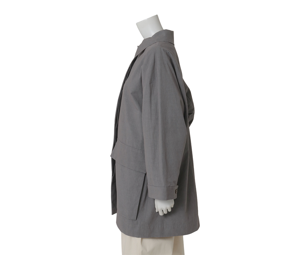カバーオールタイプのハーフコートはワーク調でありながら比翼始末ですっきりと、大きいマチ付きポケットがポイントです。