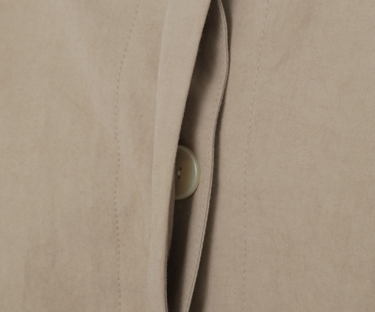 カバーオールタイプのハーフコートはワーク調でありながら比翼始末ですっきりと、大きいマチ付きポケットがポイントです。