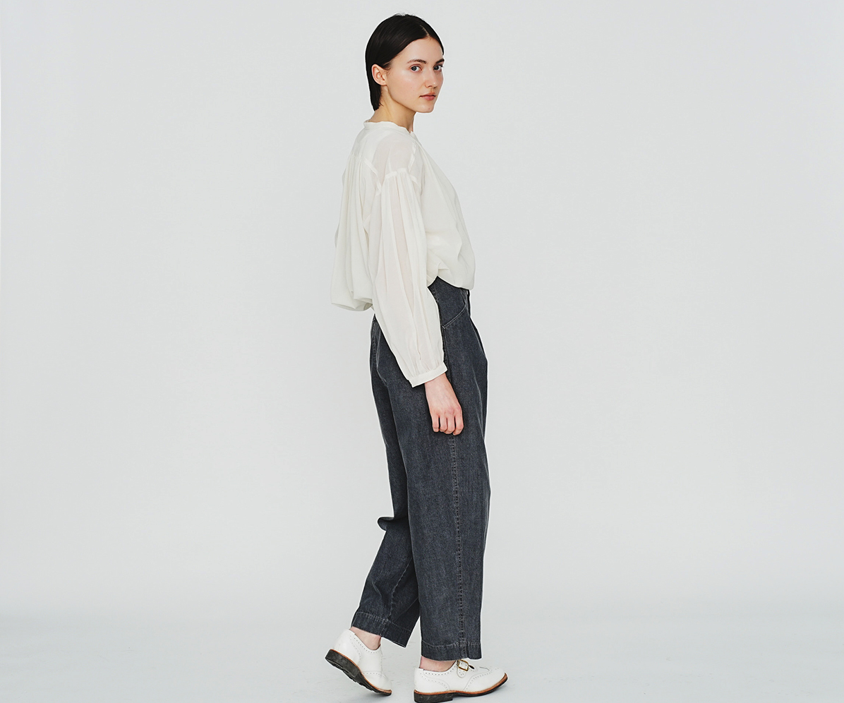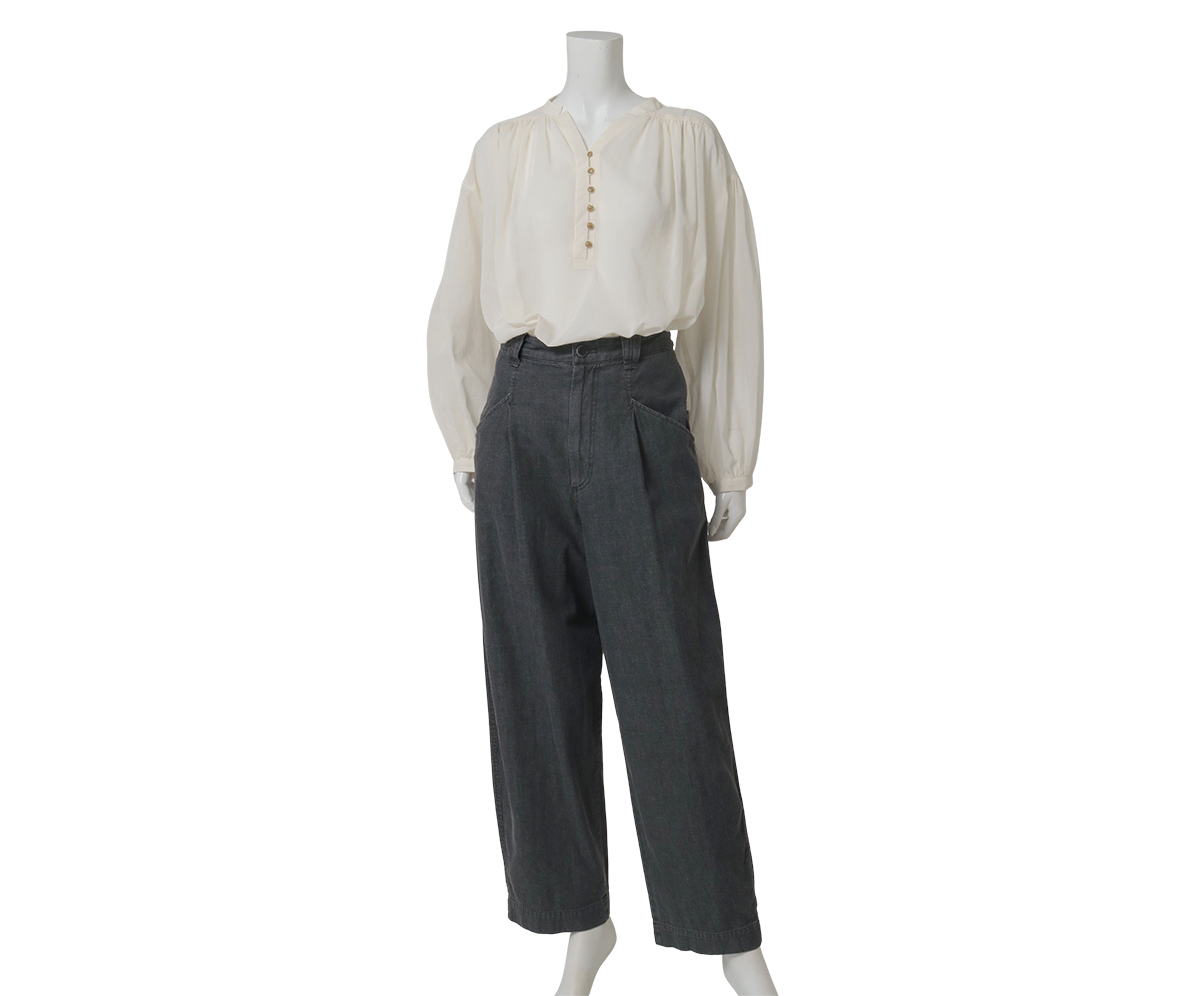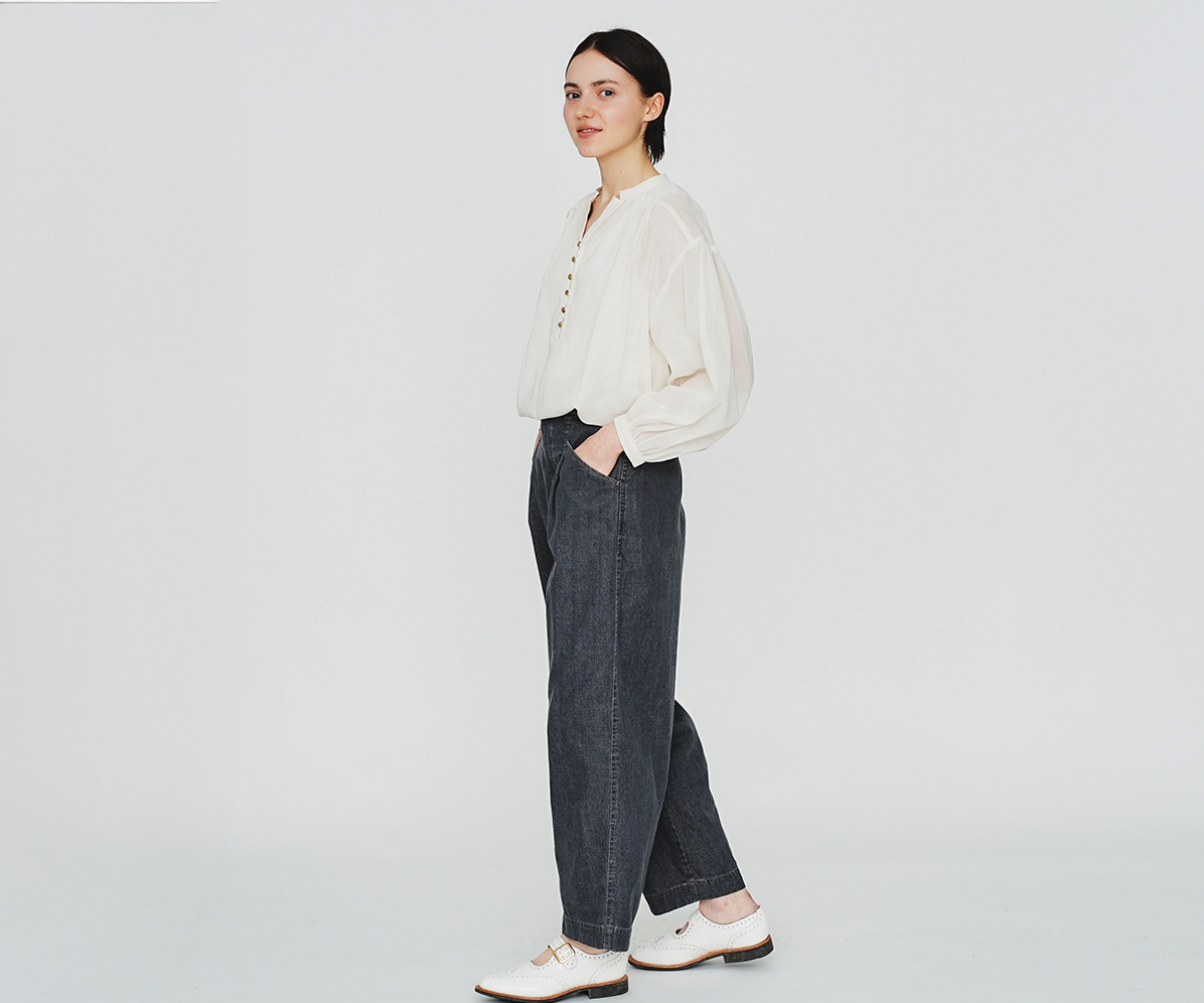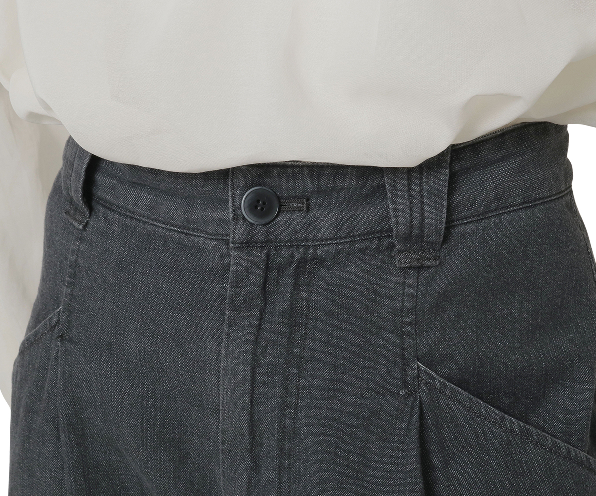 10オンスのムラ糸デニムを使い製品ブリーチををし、色と風合いを春らしく軽く仕上げました。