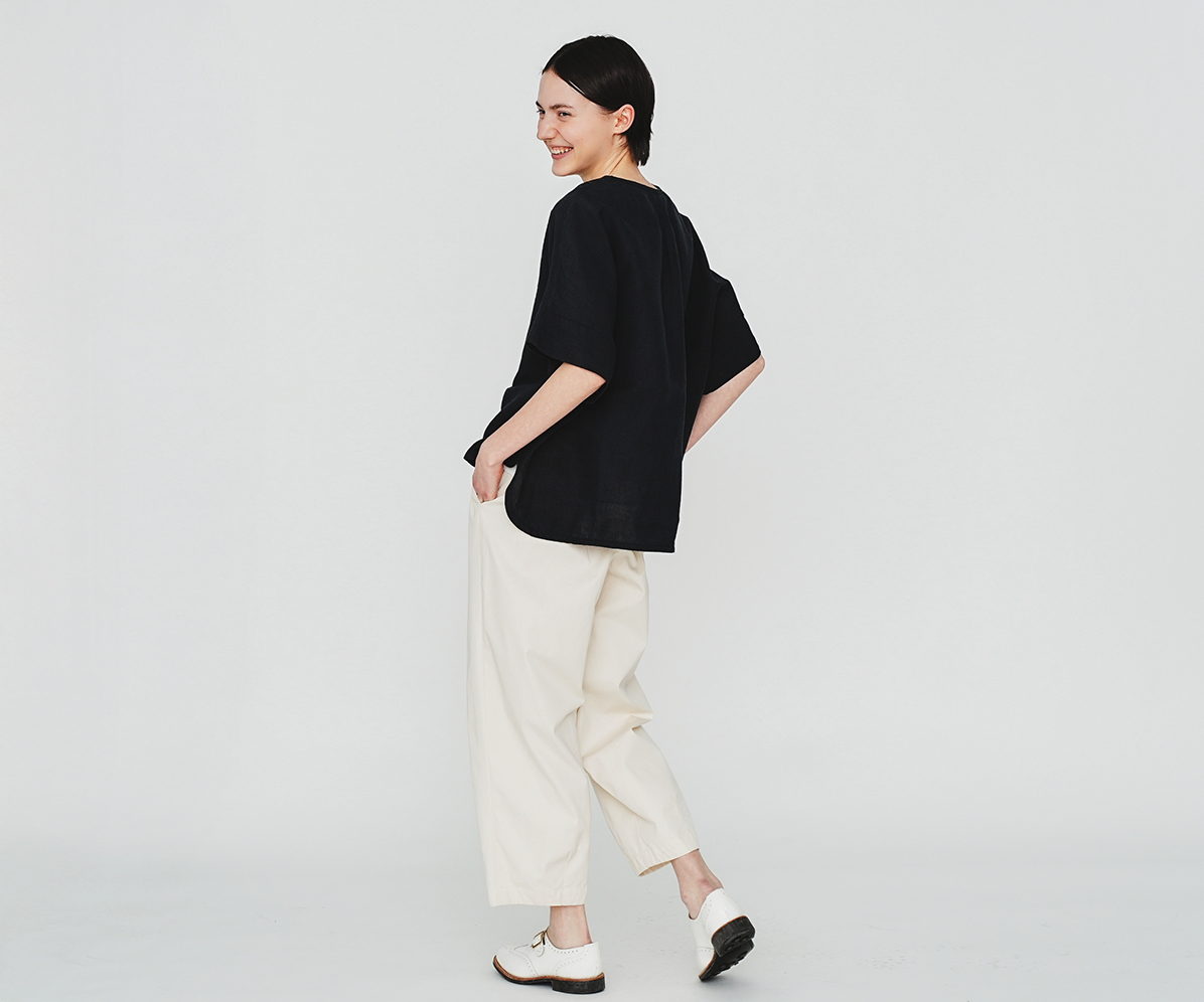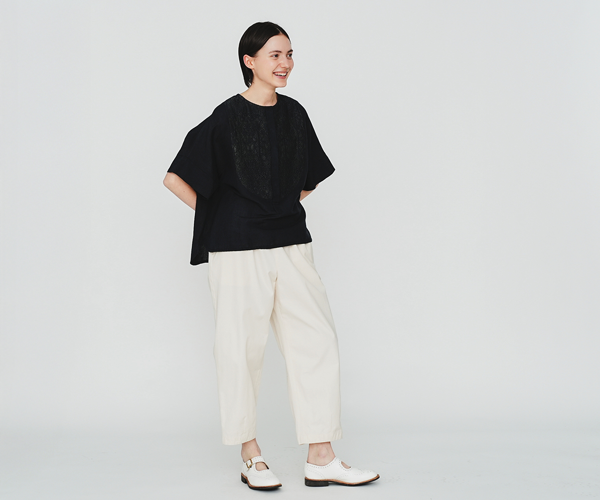 ウエストゴムで穿きやすく、春らしい明るい生成りとカーキカラーがコーディネートに活躍してくれます。
