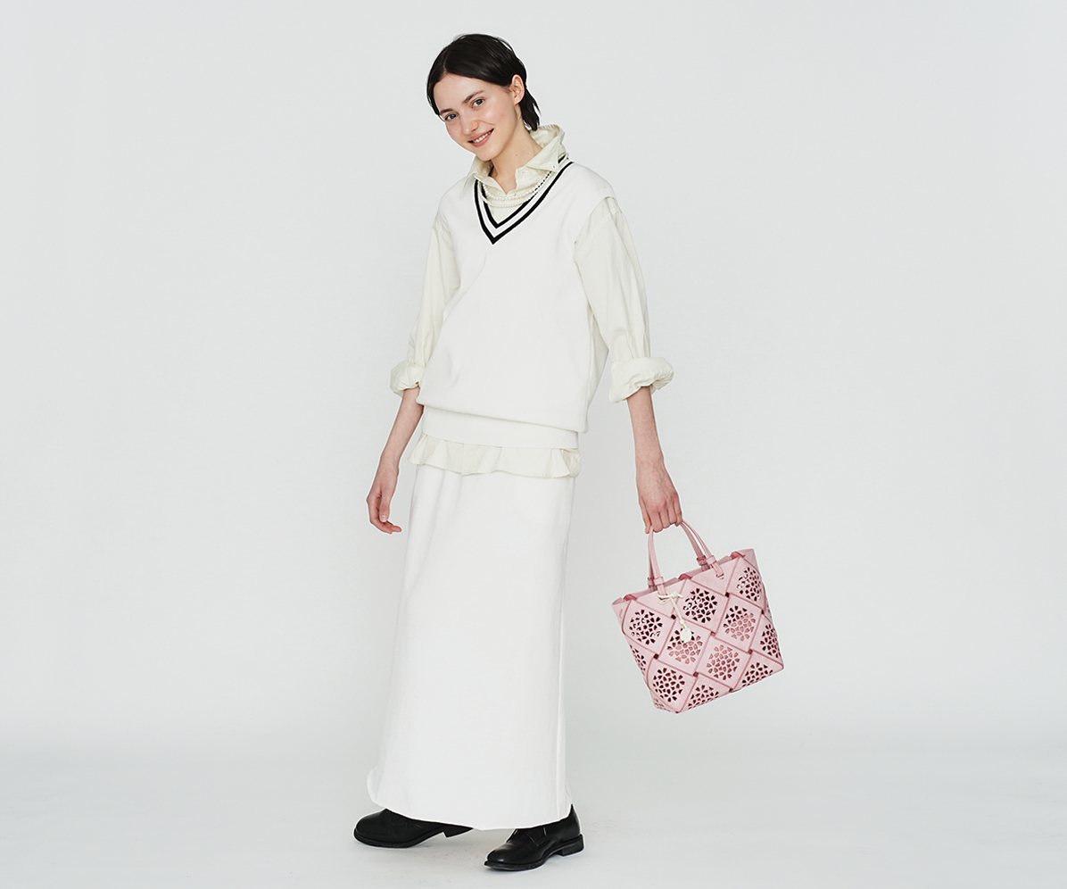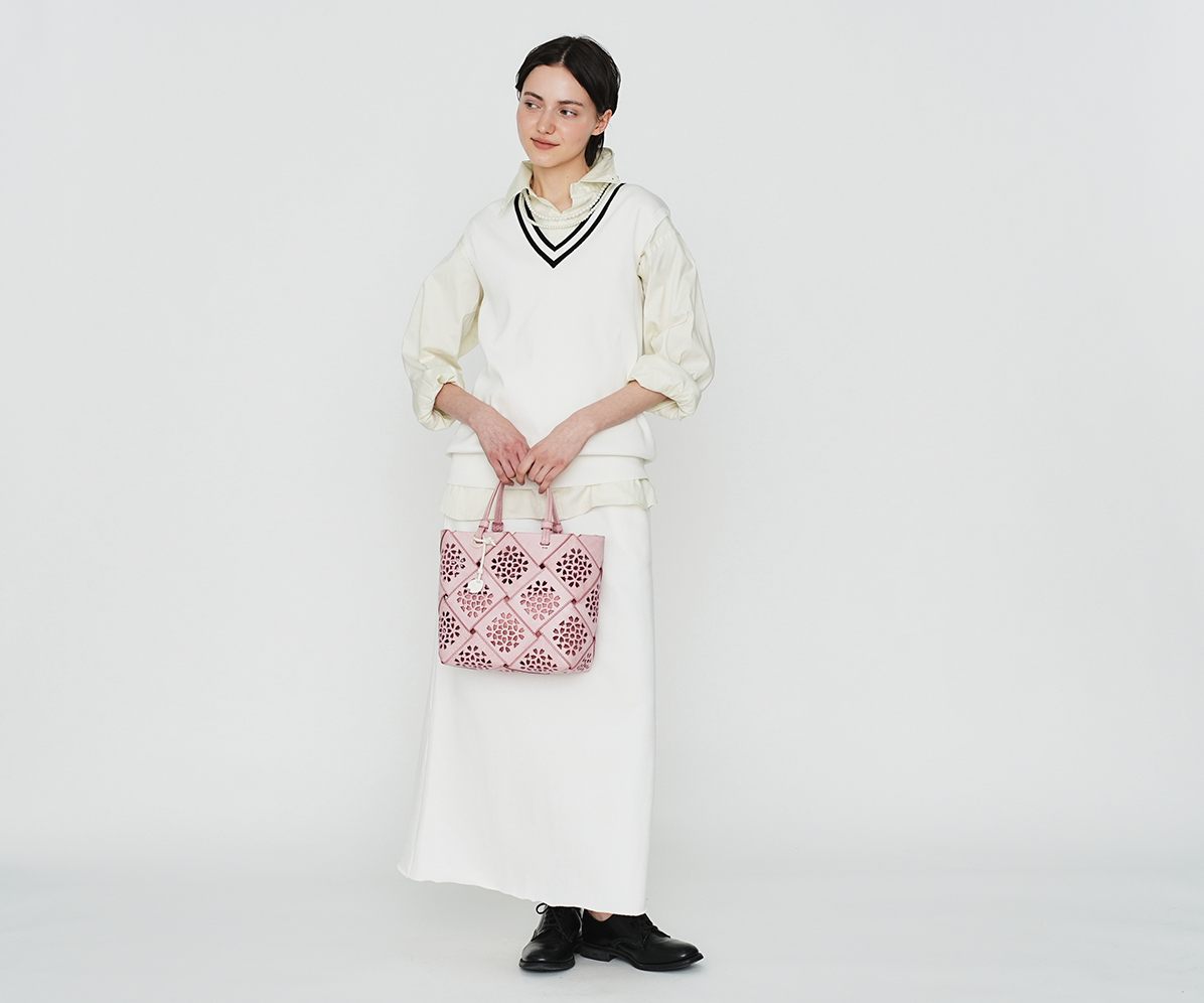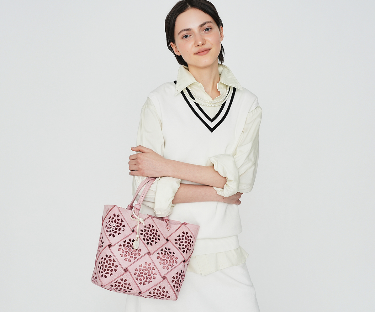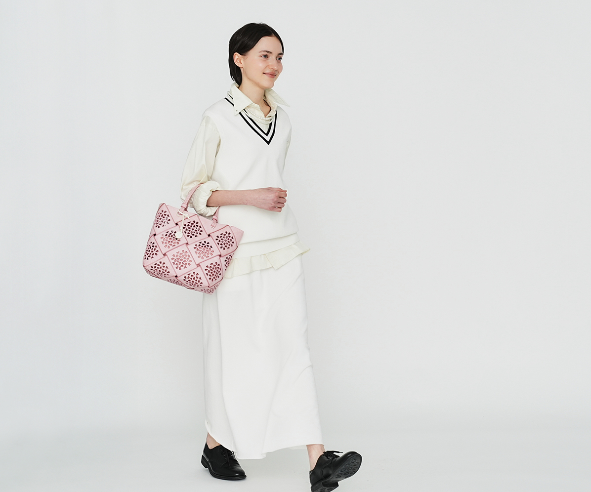 通常バスケットの「編む」を「縫う」ことにより、構造線を持たない一体成型にも似た作りを実現。